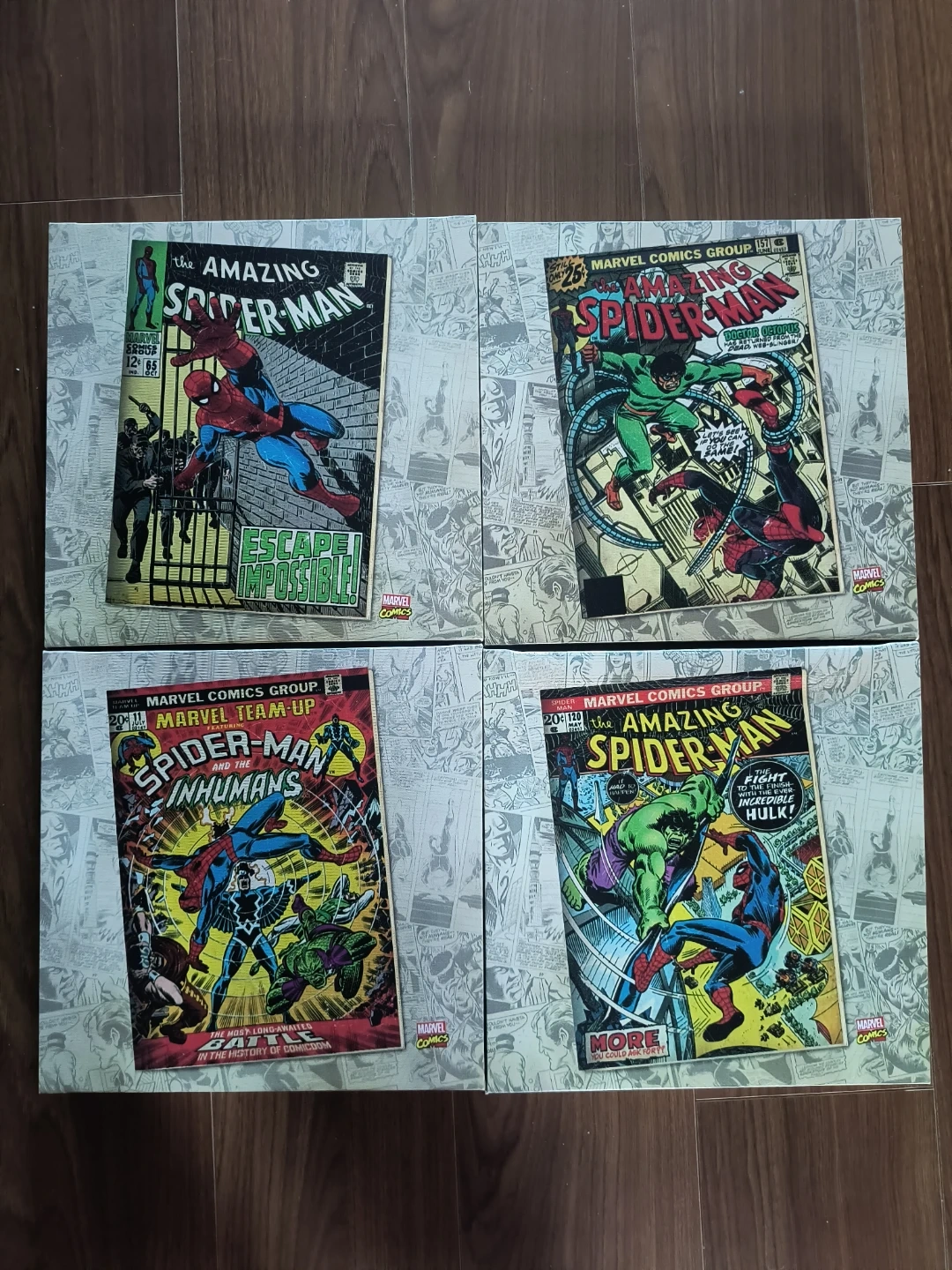 15Selling a set of four Marvel Comics Group Spider-Man themed wall art pieces. They feature classic comic book covers of The Amazing Spider-Man. Perfect for any Marvel fan's collection or to add a pop of colour to your space! Selling individually for $10 or as a set for $35