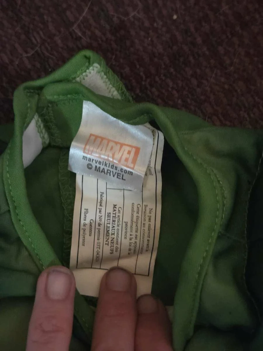 Hulk costume for your little one! Great for dress-up or Halloween. It's in good condition and ready for a new adventure! comes with hair too.. velcro under chin