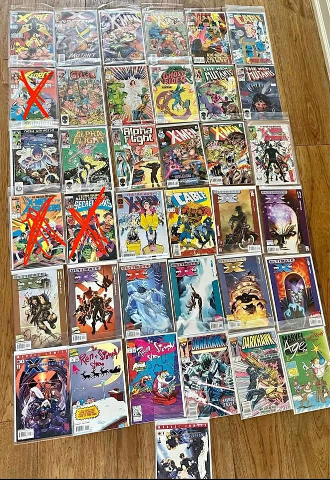 34 comics - selling as a lot Xforce 26 Xfactor 94 Uncanny xmen 278, 310, 318 (jubilee leaves xmen),322, 326, 328 Groo 8 Hulk 400 Ghost rider 78 Psiforce 11 Alpha flight 14,18 Cable 1,4 Xmen + micronauts 1 Unlimited xmen 6-12, 16 Xmen evolution 6-7 REN and stimpy 1, 15 Marvel age 121 Darkhawk 4-5 news stand New mutants 16 New mutants 18
