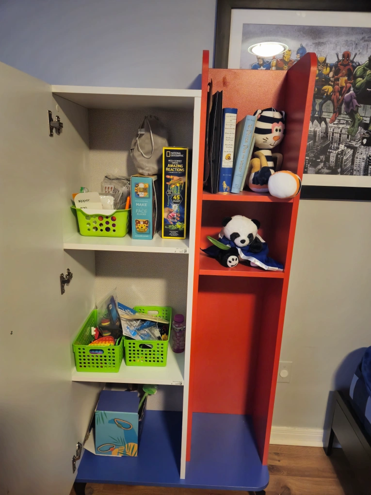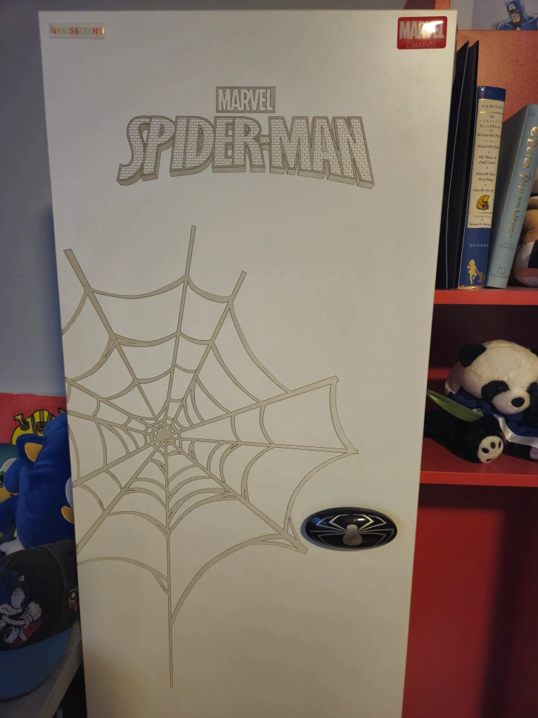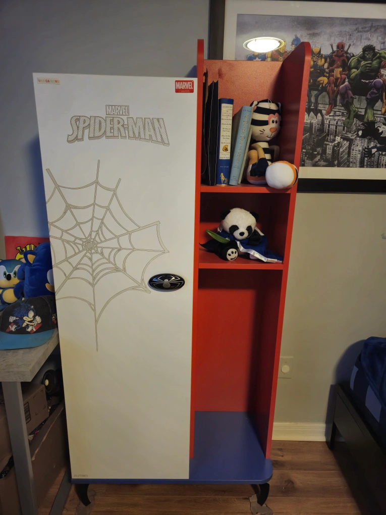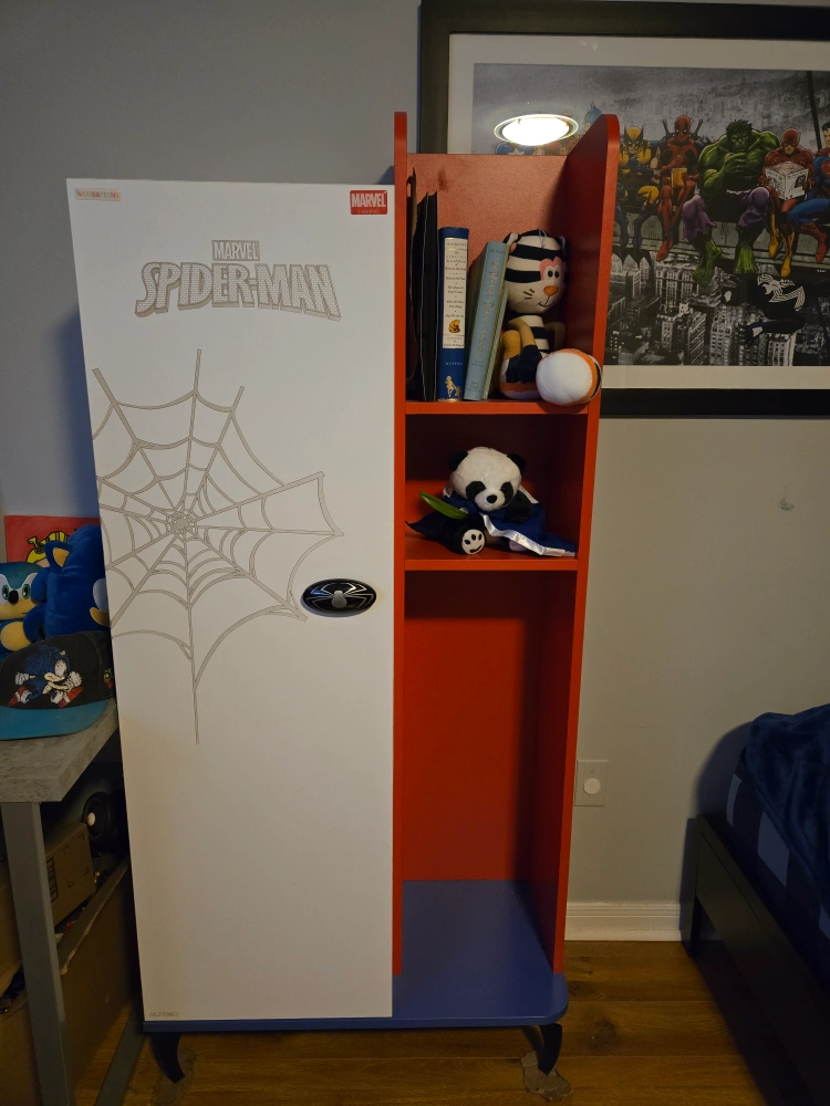 Selling a Marvel Spider-Man themed locker/bookshelf for kids! It's a fun and functional piece for any young Spider-Man fan's room. Features a locker-style door on one side and open shelving on the other, perfect for storing toys, books, and clothes 55 x 30.5 x 15 with metal legs