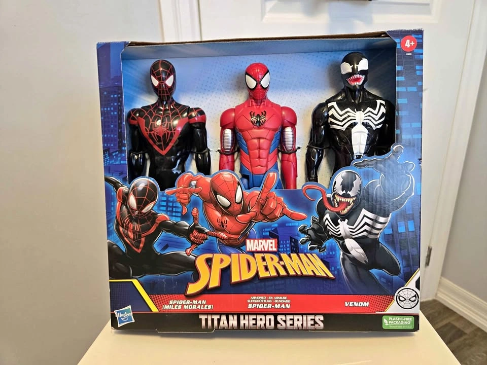 65Brand New in Box. Purchased for kids, but no longer into Spiderman. 12-INCH-SCALE ACTION FIGURES: Spider-Man (Miles Morales), Armored Spider-Man, and Venom. 3 pack. POSEABLE ACTION FIGURES: These 12-inch-scale Marvel Spider-Man action figures feature multiple points of articulation, so boys and girls ages 4 and up can pose them for web-slinging adventures they imagine