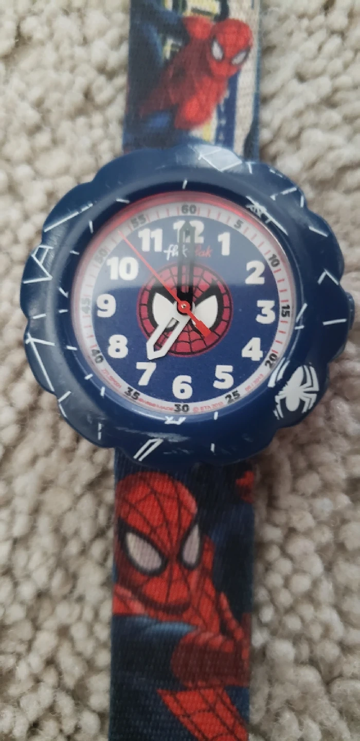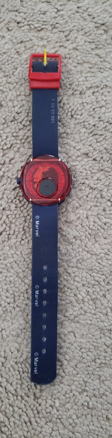 Kids Spiderman swatch watch with a red and blue band. Features a Spiderman design on the face and band. Great for any young Spiderman fan! Animal and smoke free home