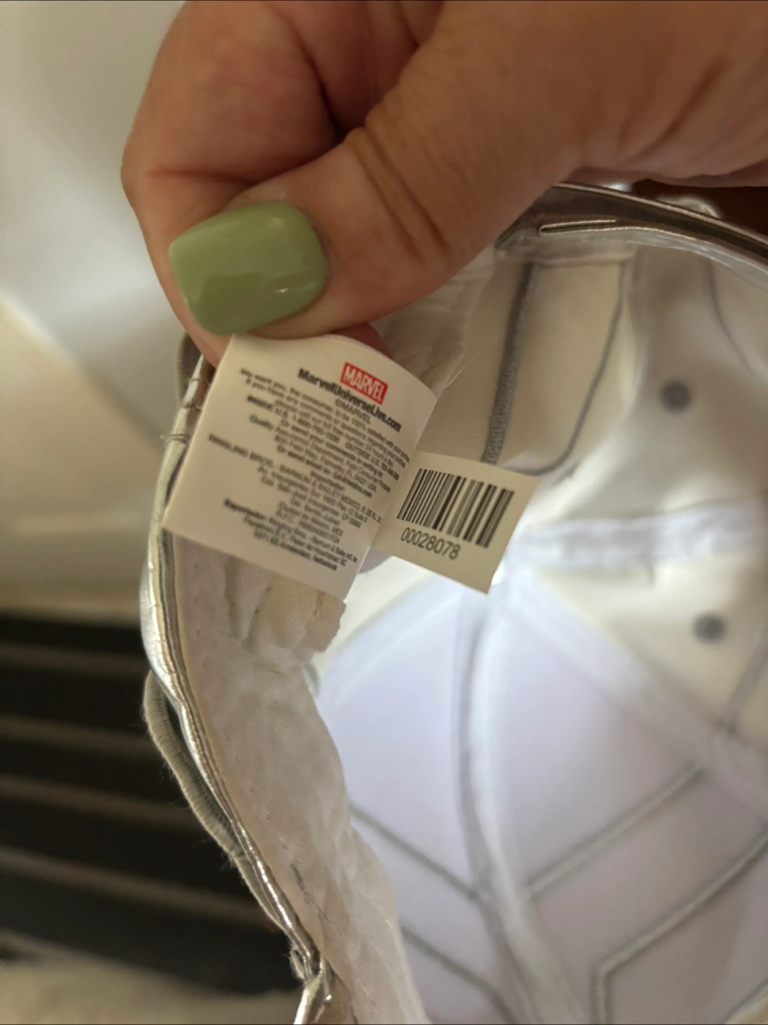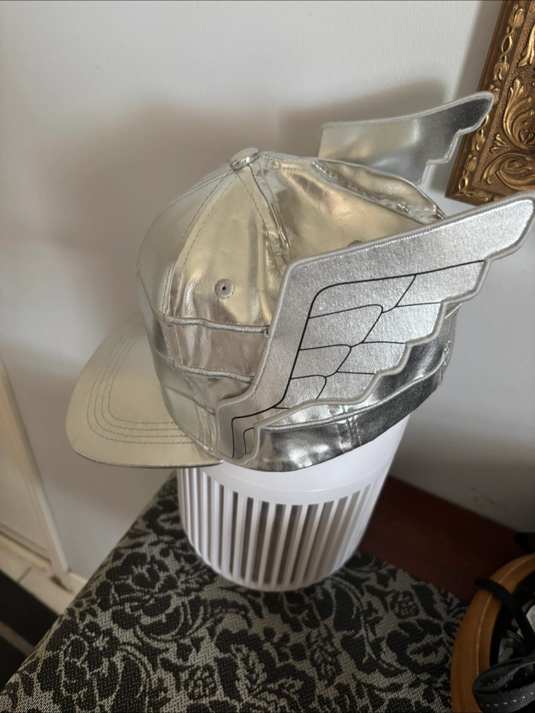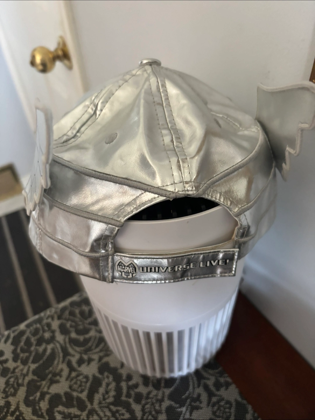 Marvel Universe Live! hat. It's a shiny silver colour and has wings on the side. Great for a Marvel fan!