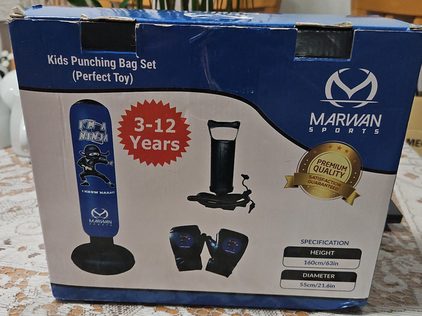 148Get your little ninja ready to train with this Marwan Sports kids punching bag set! It's designed for kids aged 3-12 years. It is completely healthy and new. The set includes: - Punching bag - Gloves - Pump Specification: - Height: 160cm/63in - Diameter: 55cm/21.6in Perfect toy for your kids! It's a great way to get your little ninja active and having fun!