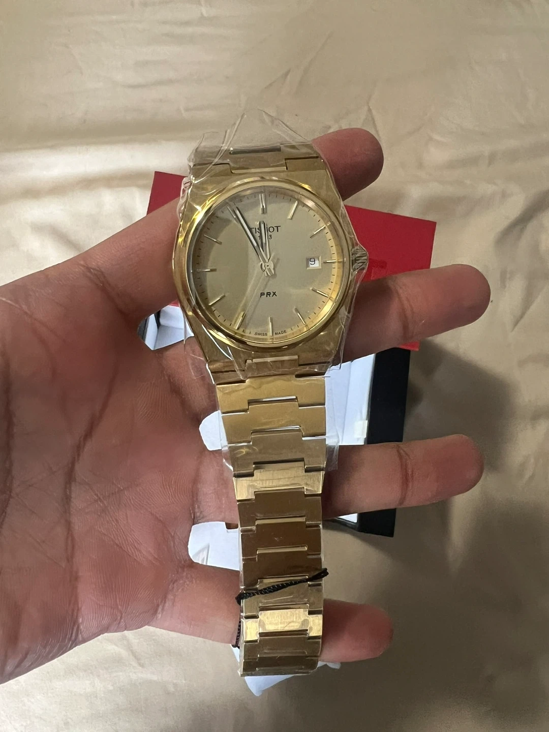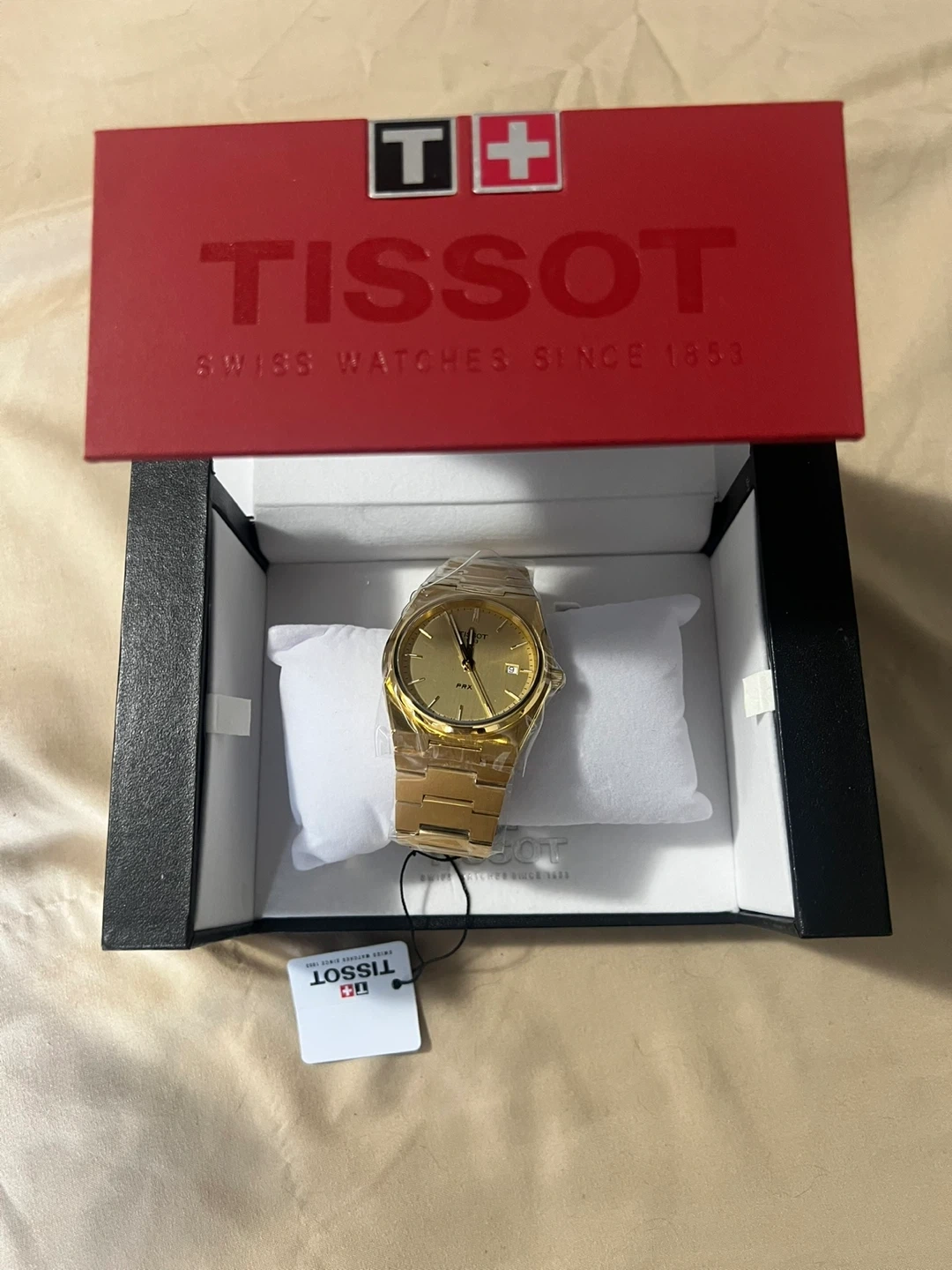 This is a Tissot PRX watch with a gold tone finish. It comes in its original box. This timepiece features a quartz movement and a classic design.