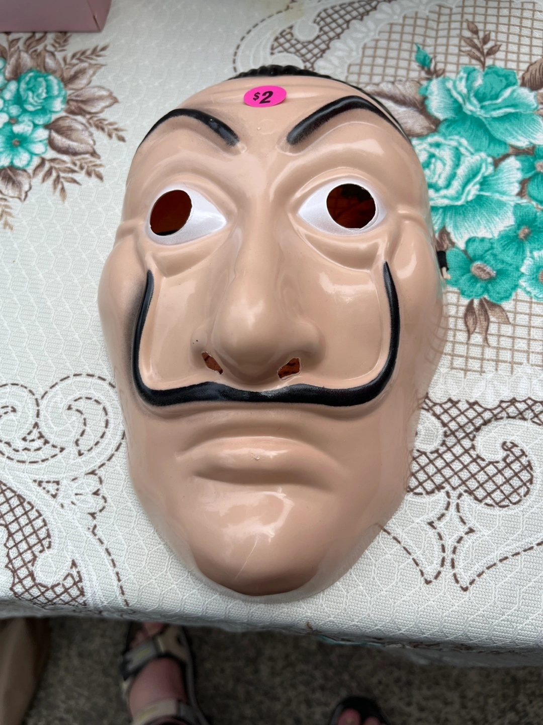 A plastic mask. It features a large nose, a prominent mustache, and thick eyebrows. It's great for Halloween or a costume party.