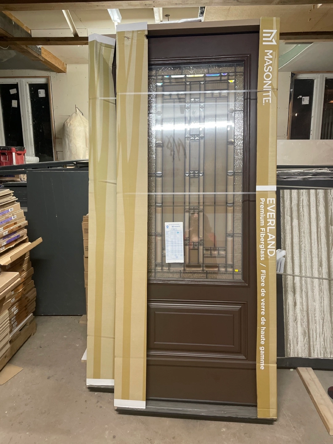 Selling a Masonite Everland premium fiberglass door. It's still in its packaging and ready for installation! It features a beautiful glass design and a rich brown finish.