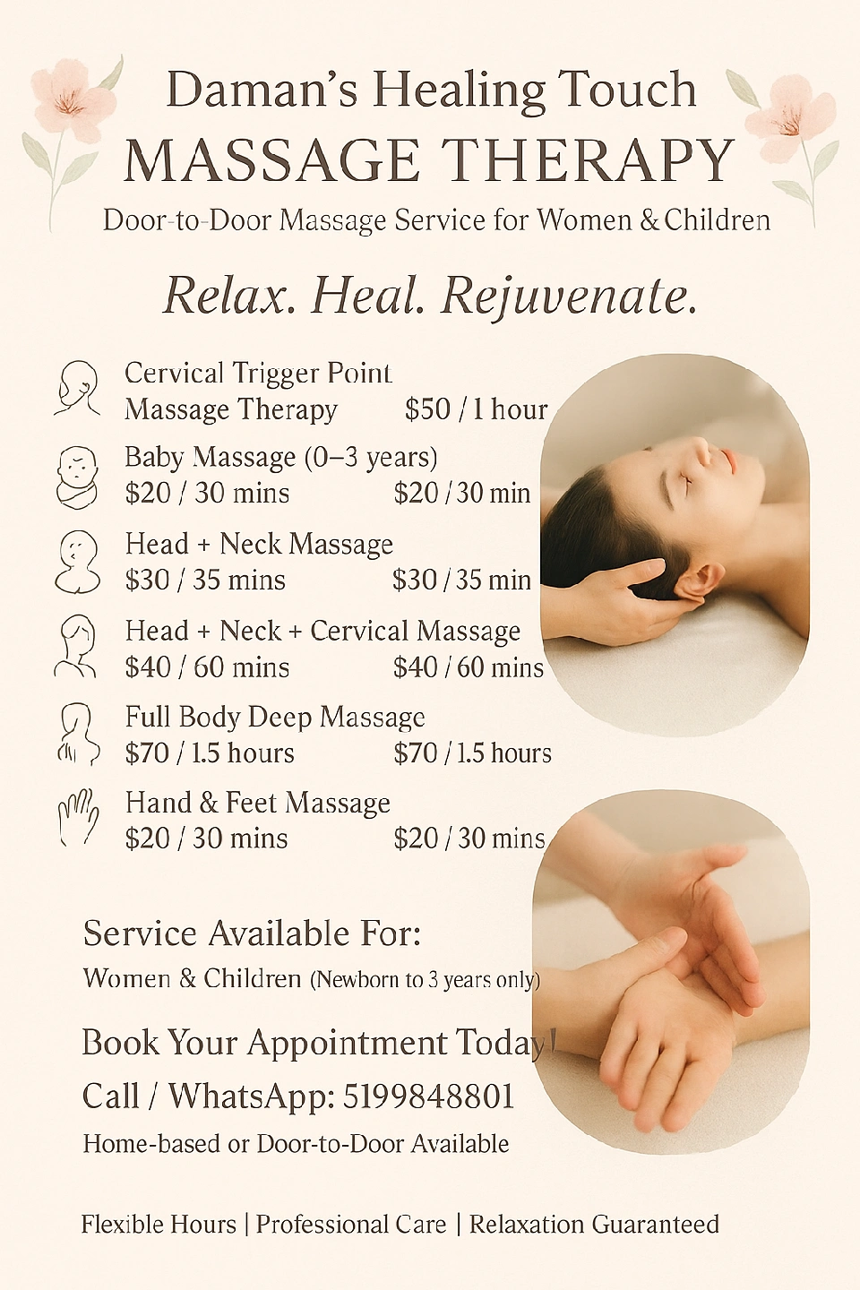 🌿✨ Relax, Heal & Rejuvenate with Professional Massage Therapy ✨🌿 ●Treat yourself to the power of healing touch! πŸ’†β€β™€οΈπŸ’†β€β™‚οΈ 》 ONLY FOR WOMEN'S AND GIRLS & BABIES TILL 3 YEARS OLD I’m offering massage therapy services designed to relieve stress, reduce pain, and restore full-body balance β€” perfect for busy minds and tired bodies. -Deep Tissue Therapy -Head, Neck & Shoulder Relief -Back Pain & Muscle Tension Relief -Cervical massage treatment πŸ“ Location: Brampton, Mississauga Call on 4372297677 Door to door service available πŸ“ž Book your appointment or message me for details!