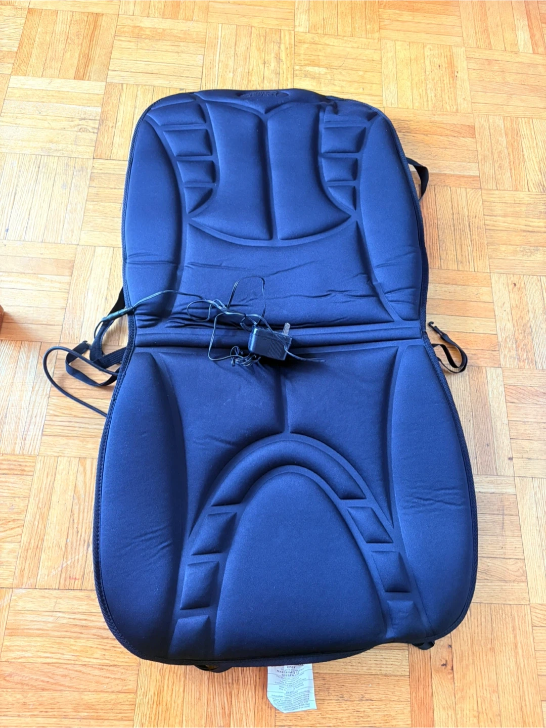 45Selling a massage seat cushion .Vibrating nodes and heating pad .It comes with the charger. Perfect for adding some comfort to your chair at home! I throw the box away