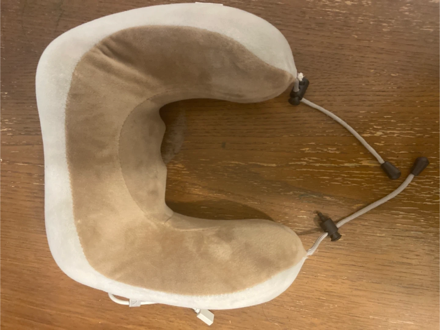 Selling a comfy massage U-shaped travel neck pillow! It's in great condition and ready for your next trip. It's beige and white with a USB charging cable. Perfect for relaxing on the go!