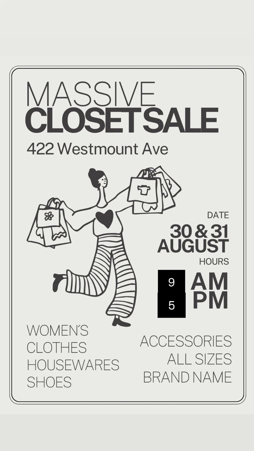 150Massive closet sale happening at 422 Westmount Ave! Find women's clothes, housewares, shoes, and accessories in all sizes and brand names. ARITZIA, LULULEMON, ZARA, NWT, SQUISHMALLOWS! The sale is on August 30 & 31 from 9 AM to 5 PM