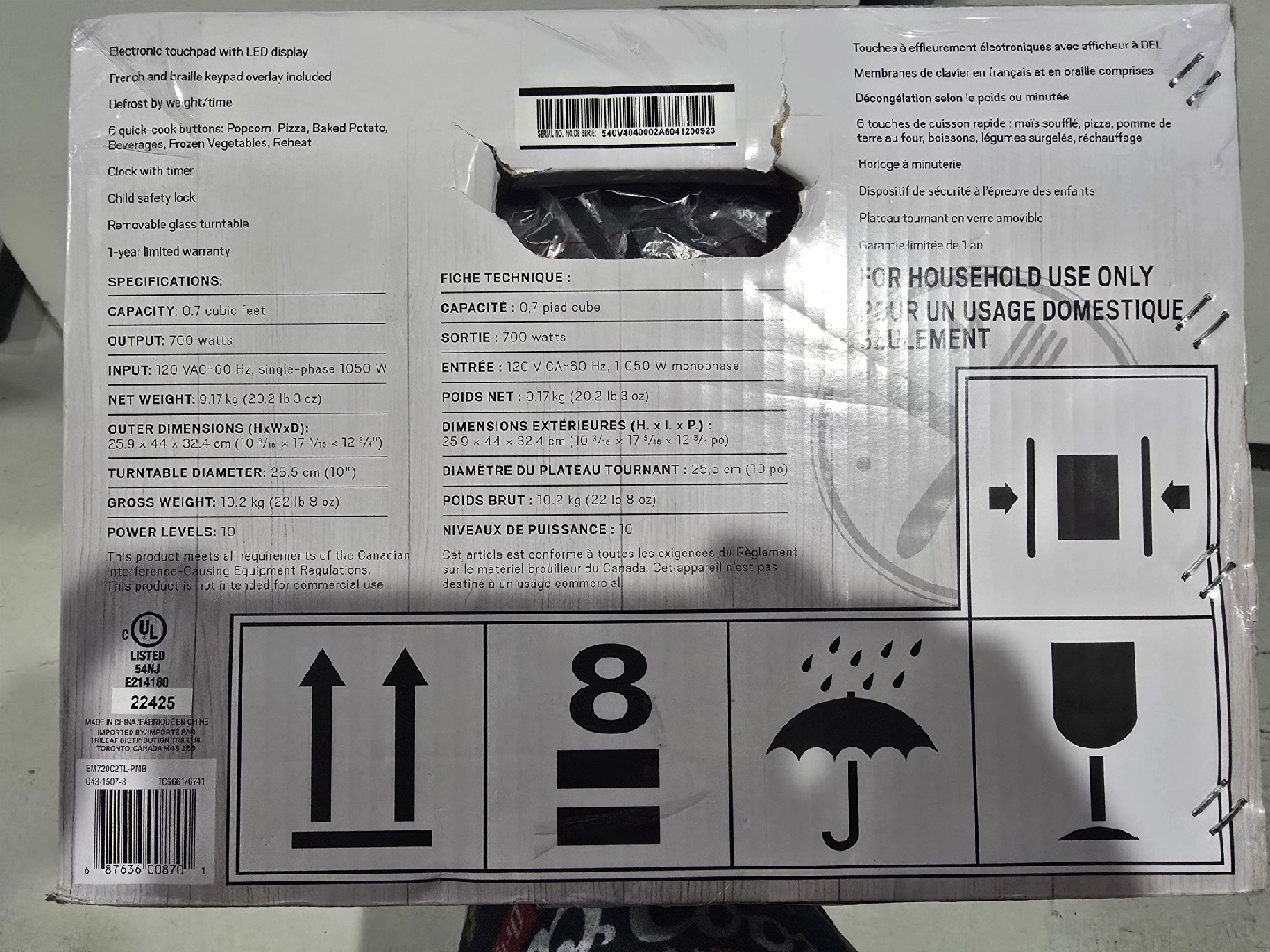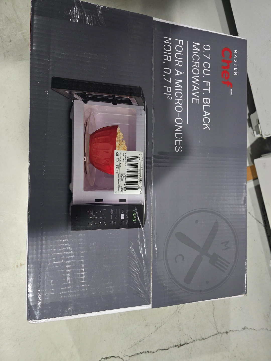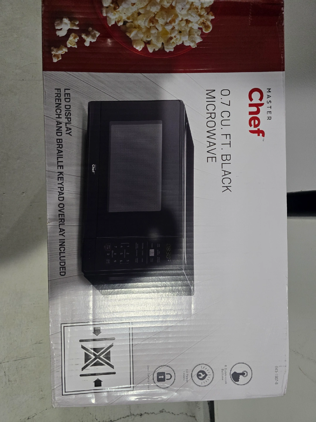Selling a Master Chef 0.7 cu. ft. Black Microwave in excellent condition! It features an electronic touchpad with an LED display, as well as a French and Braille keypad overlay. Key features include: - 5 quick-cook buttons: Popcorn, Pizza, Baked Potato, Beverage, Frozen Vegetables, Reheat - Clock with timer - Child safety lock - Removable glass turntable Item is brand new in the box and never opened. bought it for my son's friend for university and unfortunately his dorm didn't have the space. $60 firm