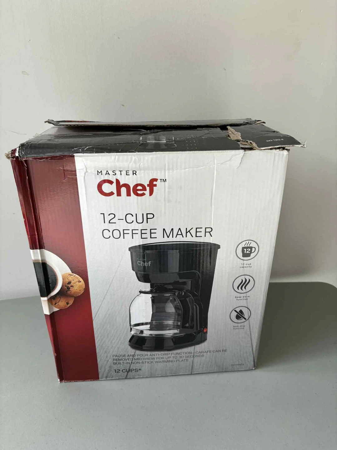 10Selling a Master Chef 12-cup coffee maker! It comes with the box and is ready to brew your favourite coffee. The carafe can be removed mid-brew, and it has a keep-warm heating plate for your convenience