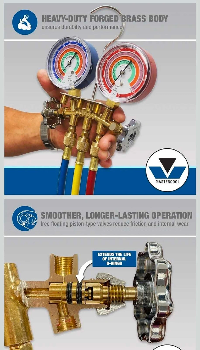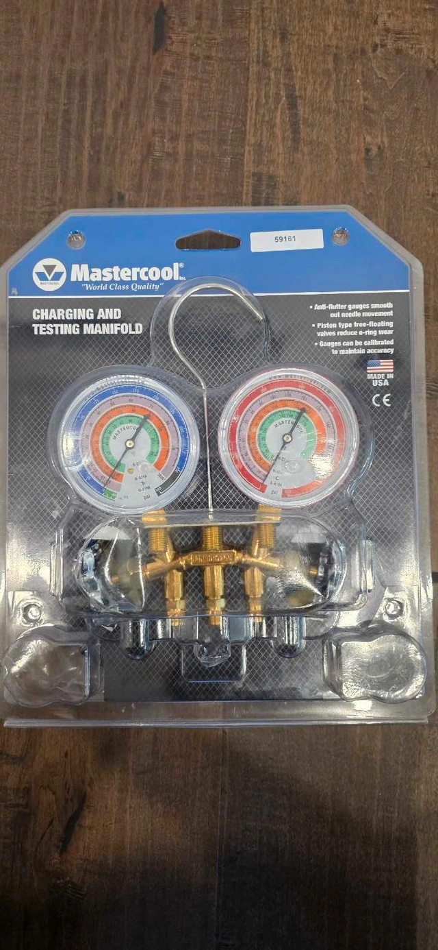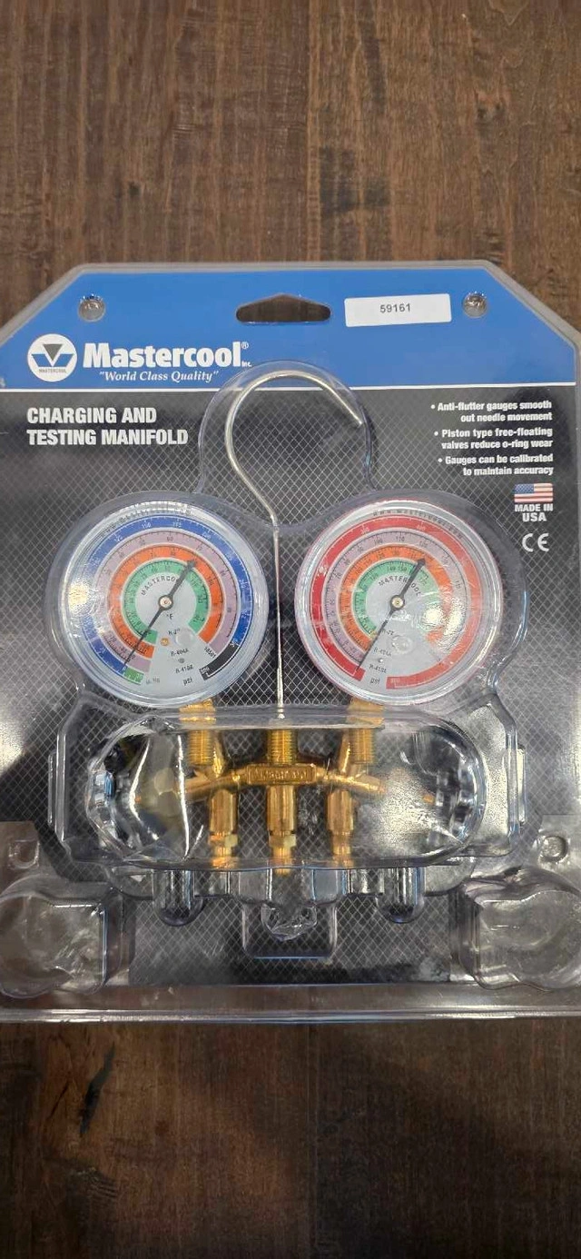 10Mastercool Charging and Testing Manifold Mastercool 59161 Brass R410A, R22, R404A 2-Way Manifold Gauge Set with 3-1/8 Inch Gauges, 3-60 Inch Hoses and Standard 1/4 Inch Fittings Selling on Amazon for $180.