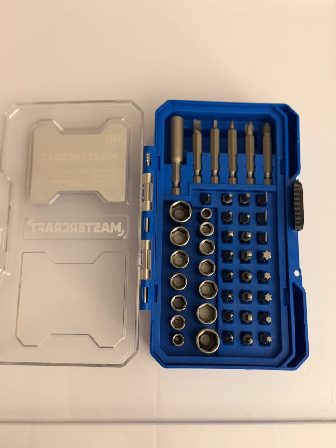 65Selling a Mastercraft 45-piece screwdriver bit and nut driver set. It includes a variety of bits and nut drivers, perfect for any DIY project around the house. Comes in a blue case for easy storage and organization