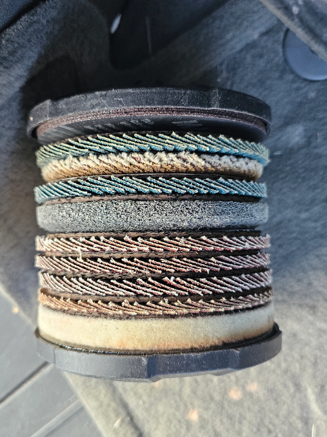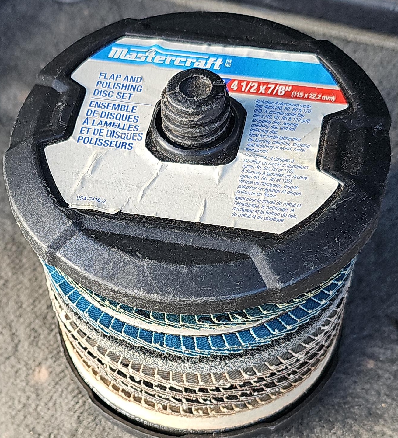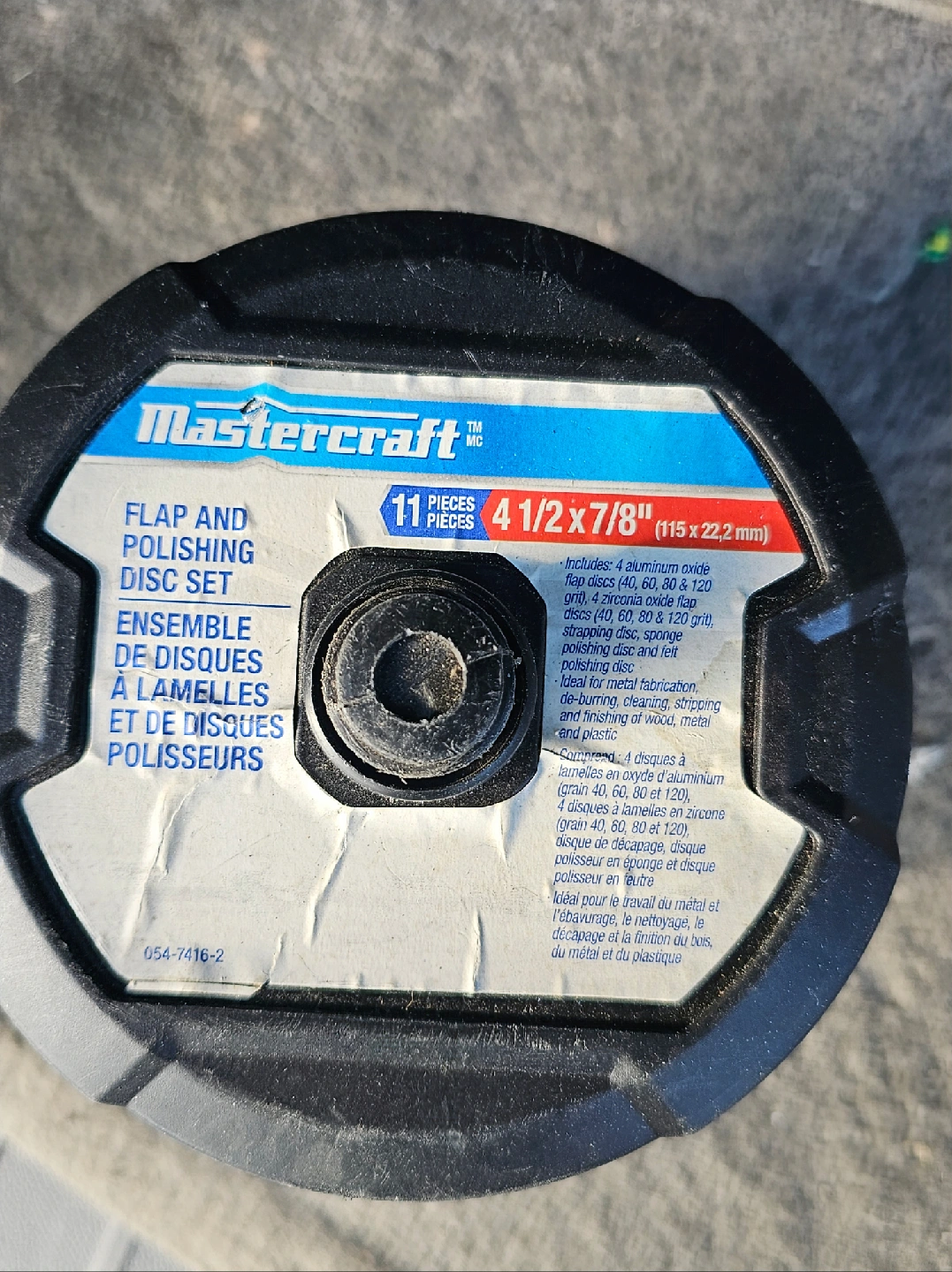 Selling a Mastercraft flap and polishing disc set. This set includes 11 pieces of discs with a size of 4 1/2 x 7/8" (115 x 22.2 mm). It includes 4 aluminum oxide flap discs and 4 zirconium flap discs, ideal for various fabrication tasks such as de-burring, cleaning, stripping, and polishing of wood, metal, and plastic
