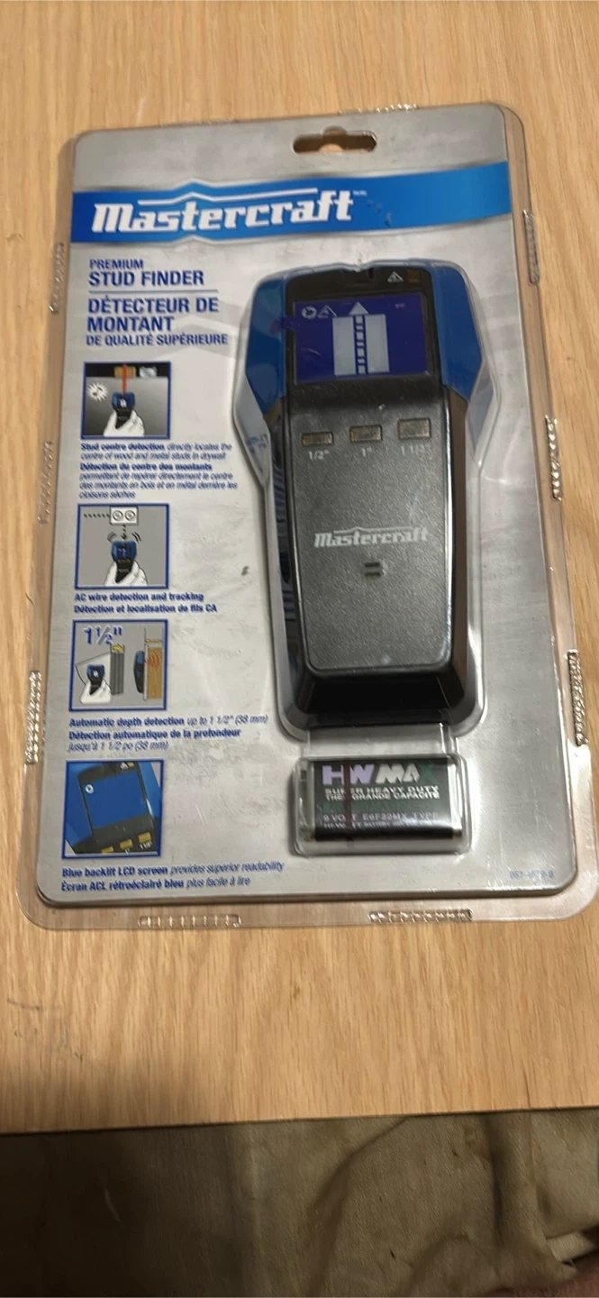 71Selling a brand new Mastercraft Premium Stud Finder, still sealed in its original packaging! It features stud centre detection, AC wire detection and tracking, and automatic depth detection up to 1 1/2" (38 mm). The blue backlit LCD screen provides superior readability