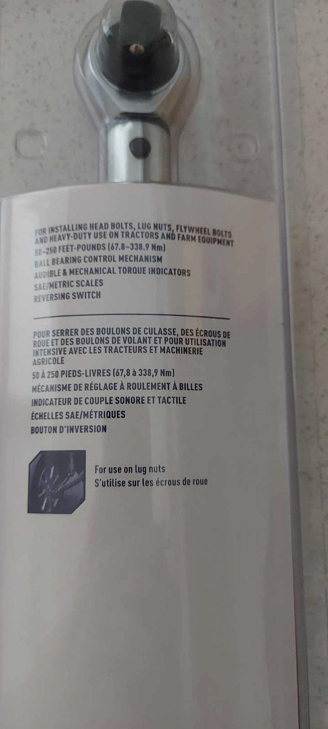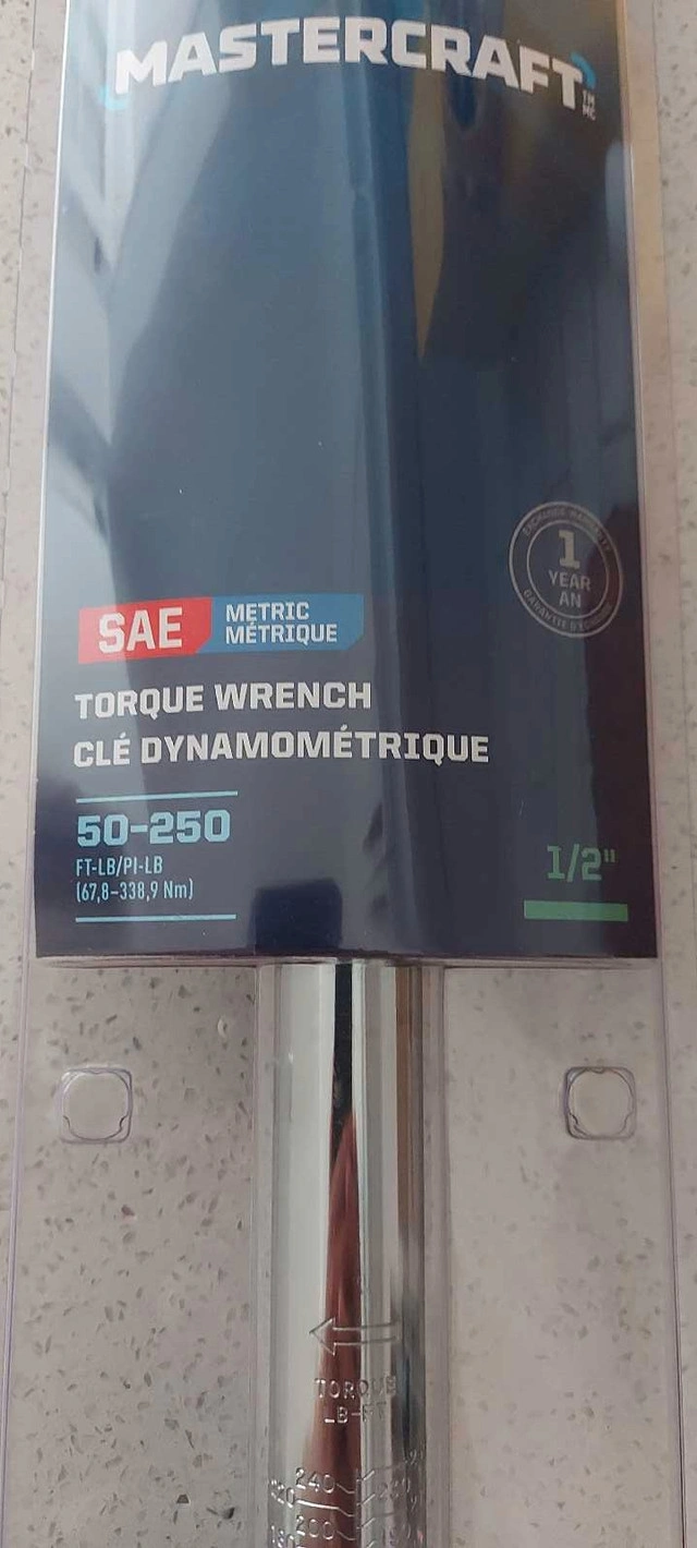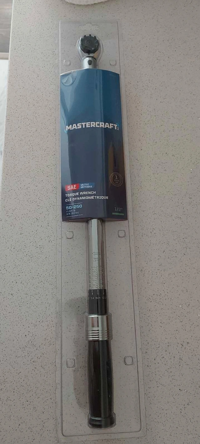 20Mastercraft Torque Wrench, 1/2-in Drive, 50-250 ft-lb. Brand new in unopened packaging. Retails for $130 at Canadian Tire.