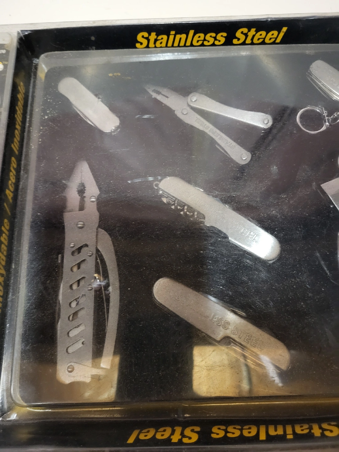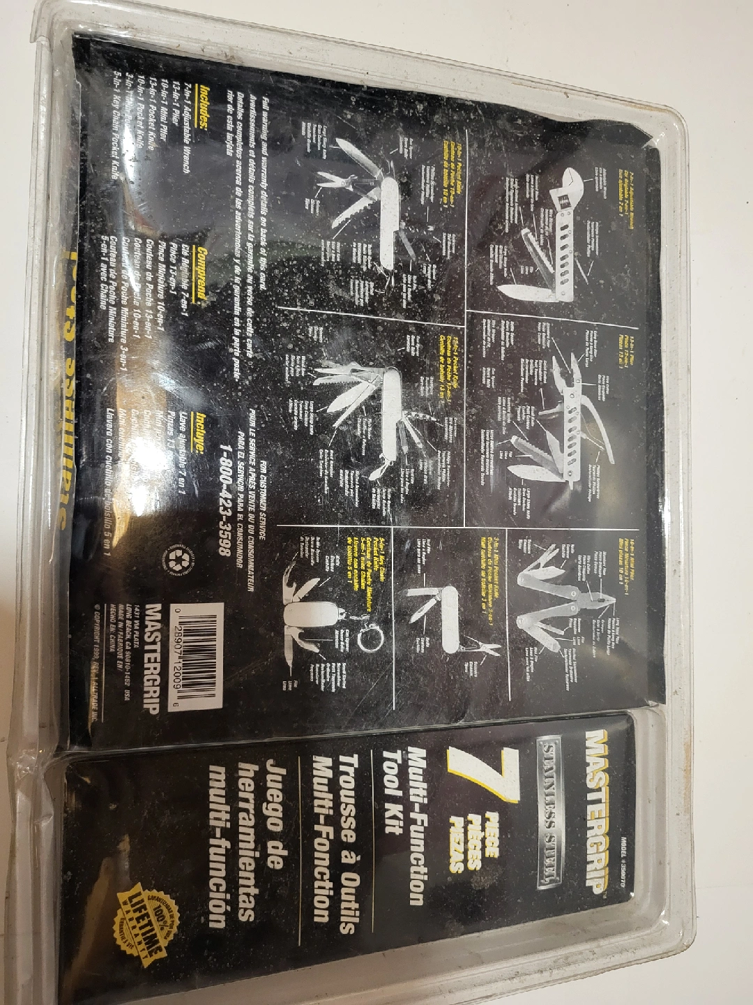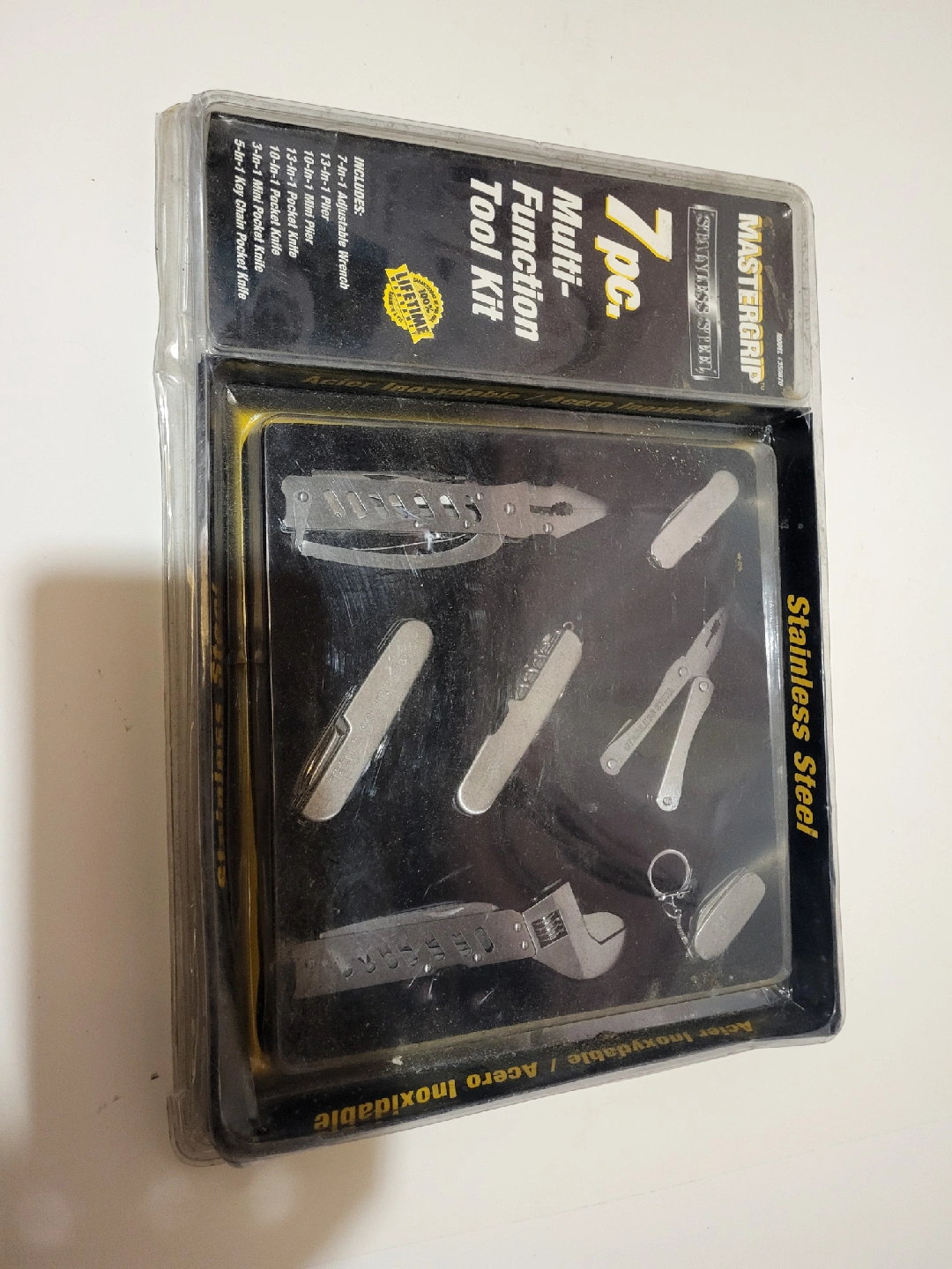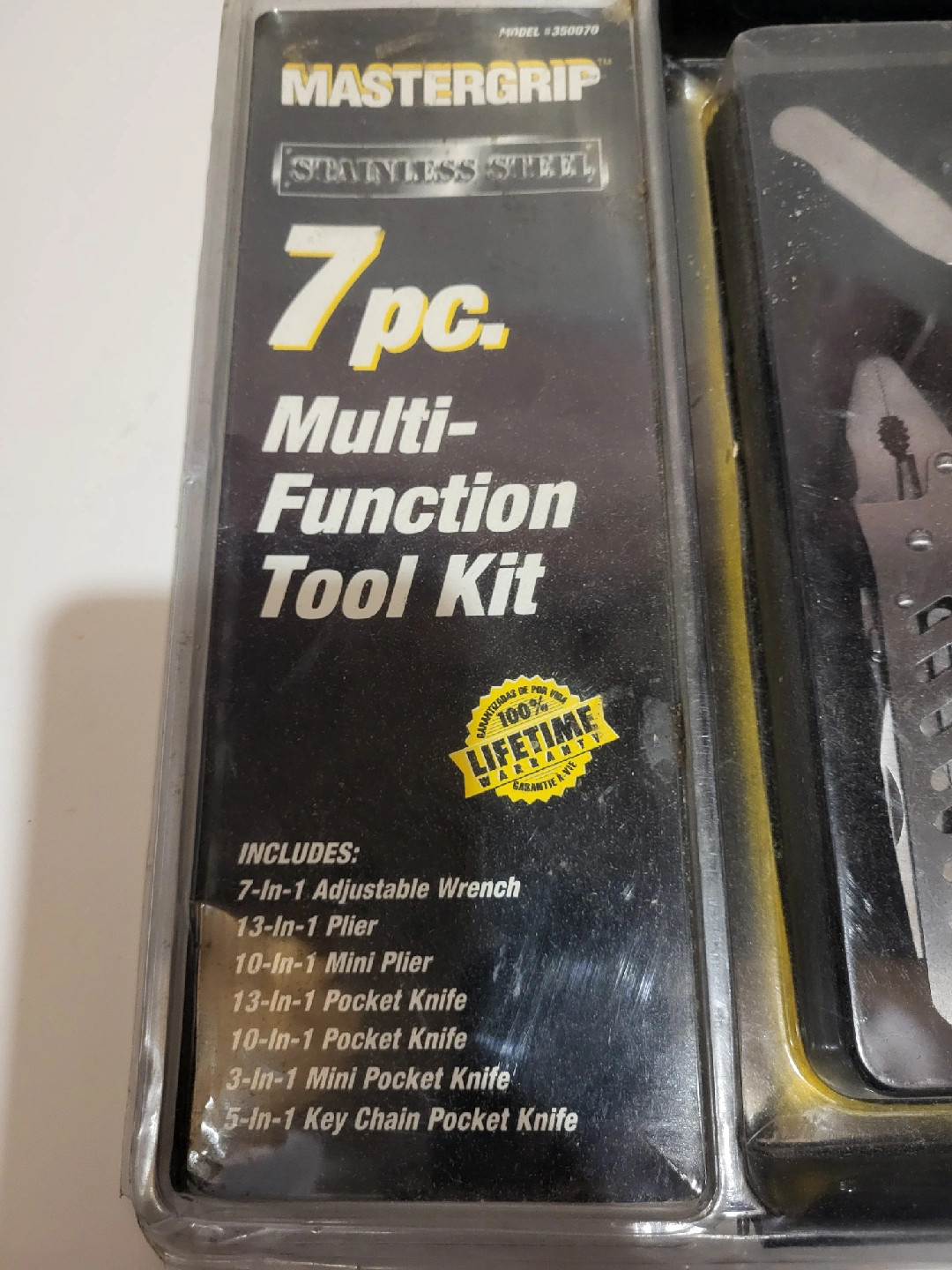 Selling a brand new Mastergrip 7-piece multi-function tool kit! This stainless steel kit includes: - 7-in-1 Adjustable Wrench - 13-in-1 Plier - 10-in-1 Mini Plier - 13-in-1 Pocket Knife - 10-in-1 Pocket Knife - 3-in-1 Mini Pocket Knife - 5-in-1 Key Chain Pocket Knife Comes in its original packaging