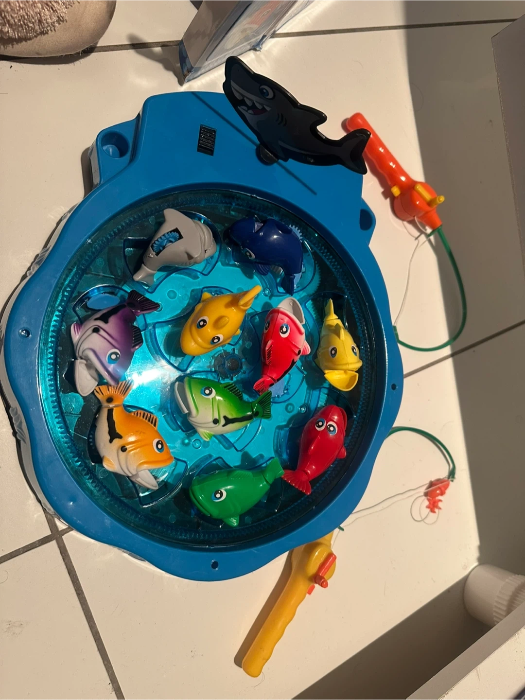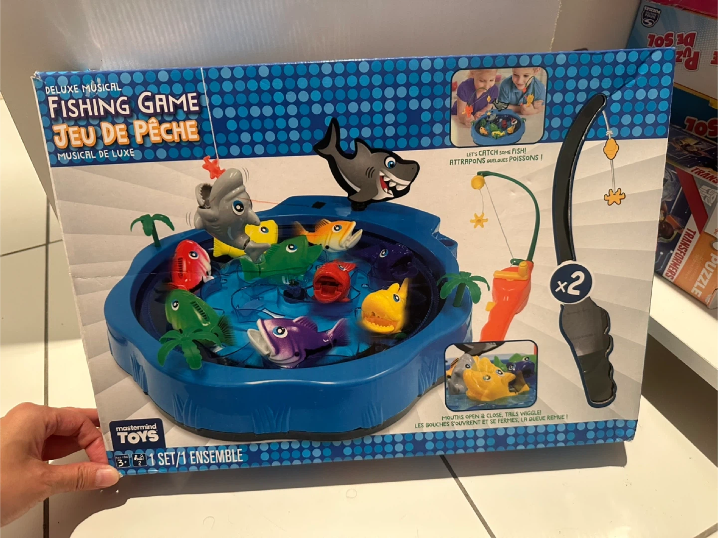 10Here's a gently used Mastermind Toys Deluxe Musical Fishing Game! It's a fun game for little ones. It includes the rotating board with colourful fish and two fishing rods. Let's catch some fish!