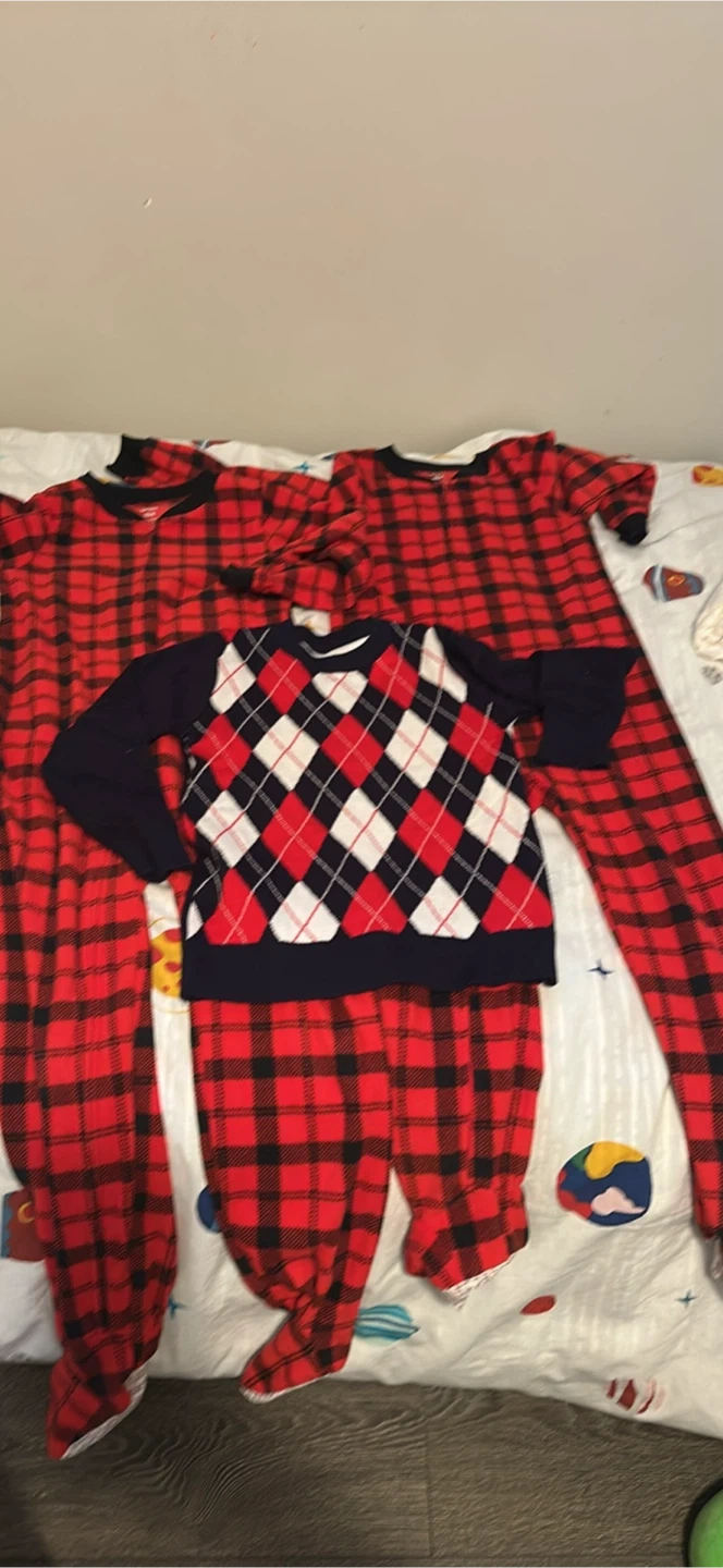 10Get ready for cozy nights with these adorable matching family pajamas! Featuring a classic red plaid pattern, these PJs are perfect for holiday photos or just lounging around the house. The set includes a sweater with an argyle pattern.