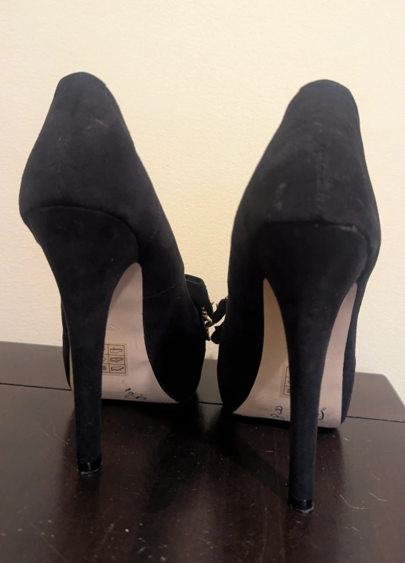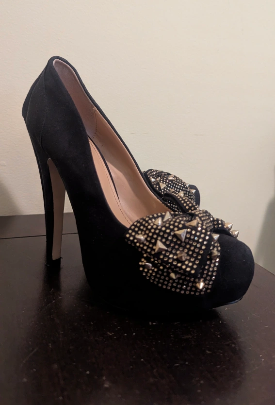 These black heels from Material Girl are sure to make a statement! They feature a cute bow on the toe, adorned with studs. Perfect for a night out or adding a bit of edge to your outfit
