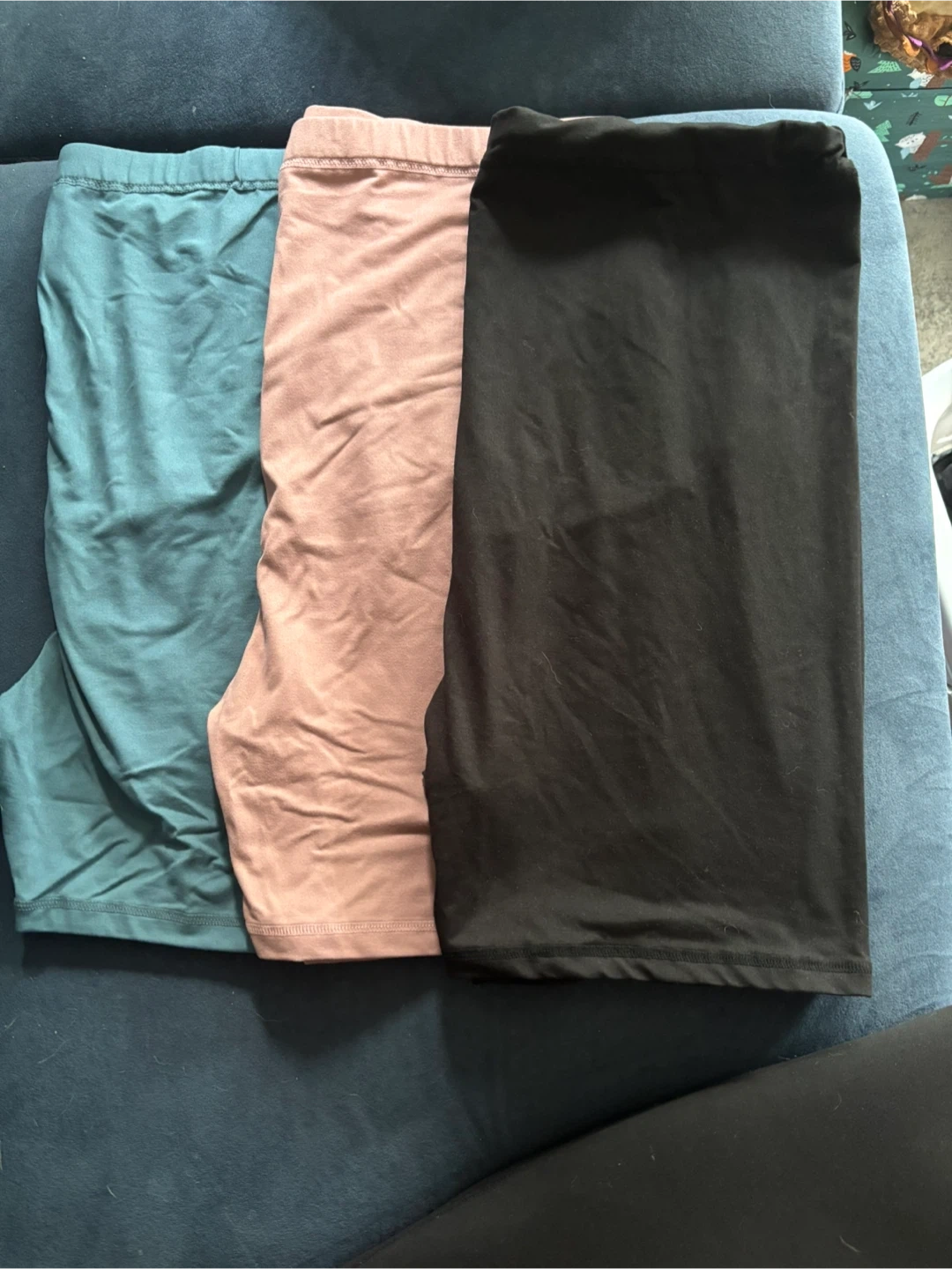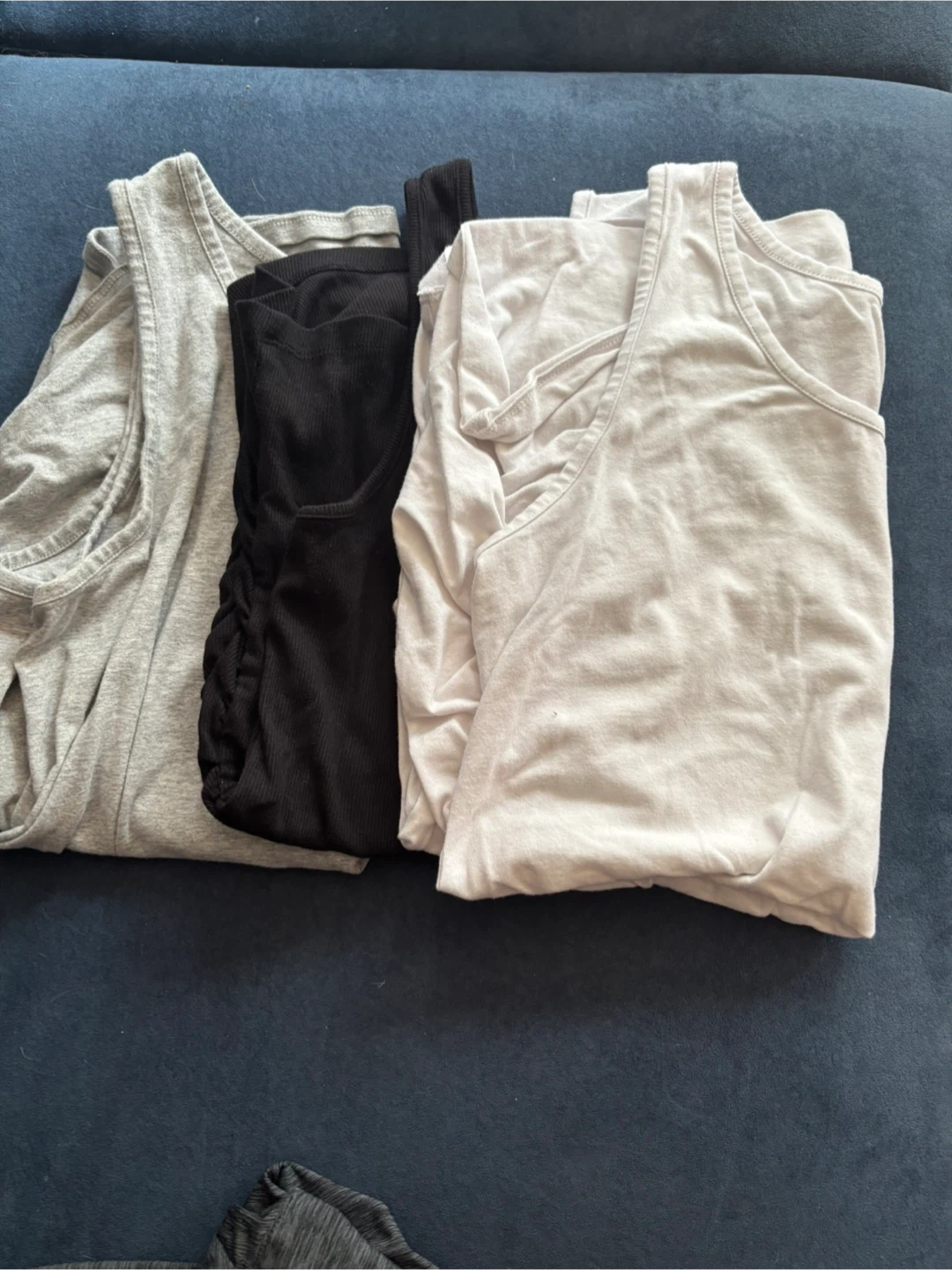 18- 3 pairs of adjustable waist band shorts (size L) - 1 pair of black leggings (size XL) - 1 pair of grey yoga pants (size L) - 2 pairs of black yoga pants (size L) - 2 pairs of black jeans (size L + XL) - Black, white and grey tank tops (sizes L(3), XL(7) and XXL(2)) - 1 grey zip up sweater (size L) - 1 grey striped hoodie (size M) - 5 shirts (size XL) - 1 shirt (size L) - 1 shirt (size XXL) - 1 pair of leopard print pyjama pants (size M)