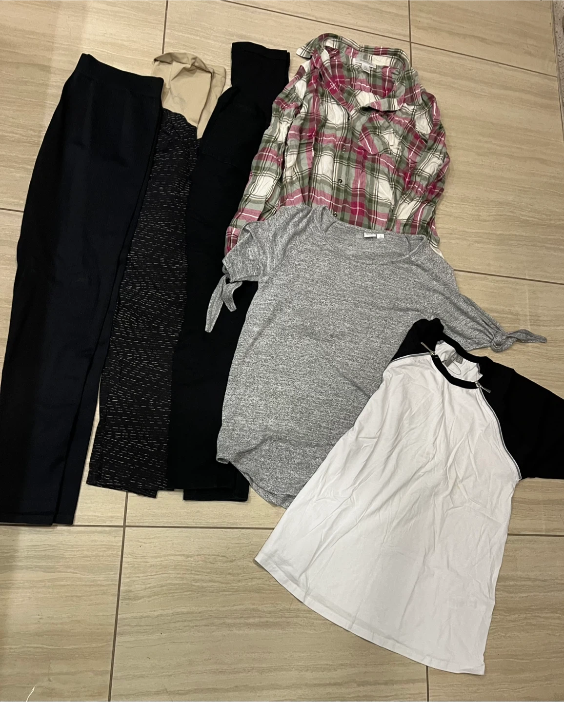 33$30 is for all items. Msg for separate pricing 3 Maternity Leggings & 3 Maternity Tops 1- Size L by H & M, black ribbed leggings with stretch (New) 1- Size L by Motherhood, black with beige flecks leggings. Has maternity panel. 1- Size L by Motherhood, black leggings with back pockets. Has maternity panel. 1- Size S by Motherhood, plaid green, fuschia & white button down shirt 1- Size S by Gap (new with tags), Gray/white light knit top with peek-a-boo tie sleeves 1- Size 8 by asos (new with tags), white tshirt with black satiny sleeves & decorative zippers armpit to neck.
