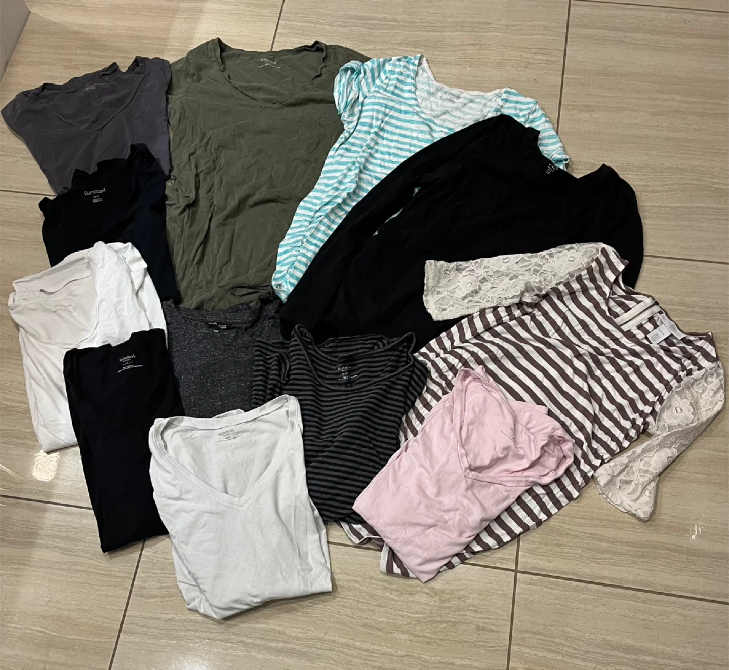 Size M 7 Short sleeved maternity tshirts, 5 by Motherhood, 2 by Bump Start & one by George. Size M 4 long sleeved tshirts, white & striped by Motherhood, one size S black by Gap. plus one size M striped brown/white with gold zipper on back & lace 3/4 sleeves
