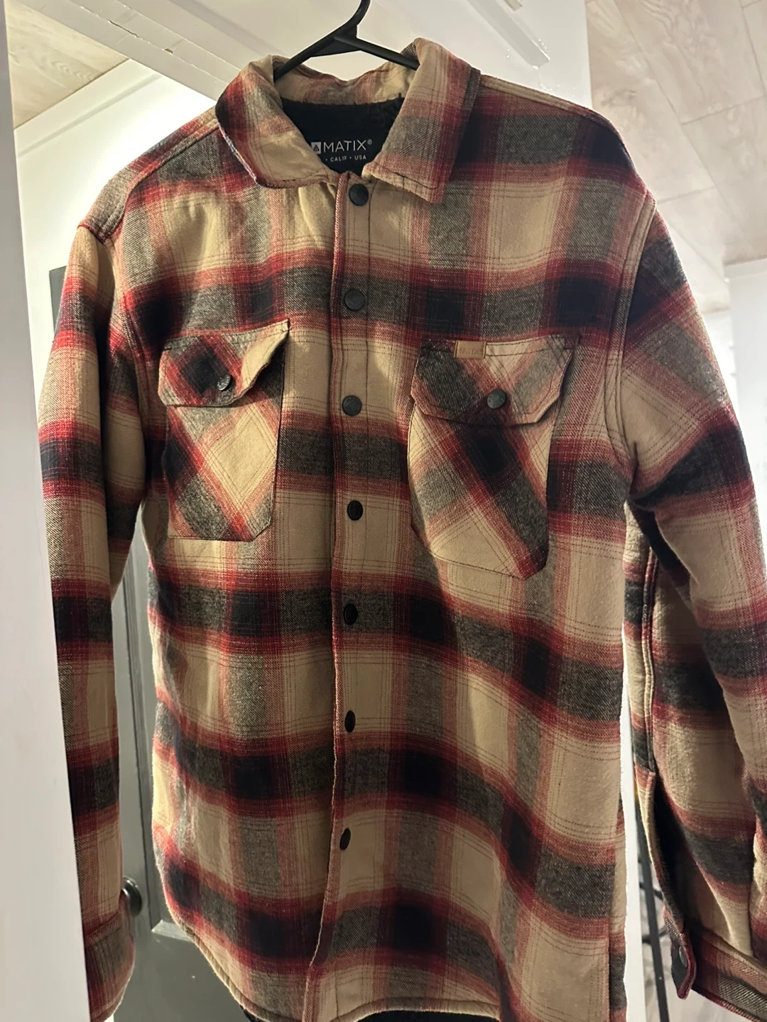 Cozy Matix flannel shirt jacket, perfect for layering! Thicker with the Sherpa like inside . It's a size medium and features a classic plaid pattern in beige, red, and black. Great for adding some warmth and style to your wardrobe