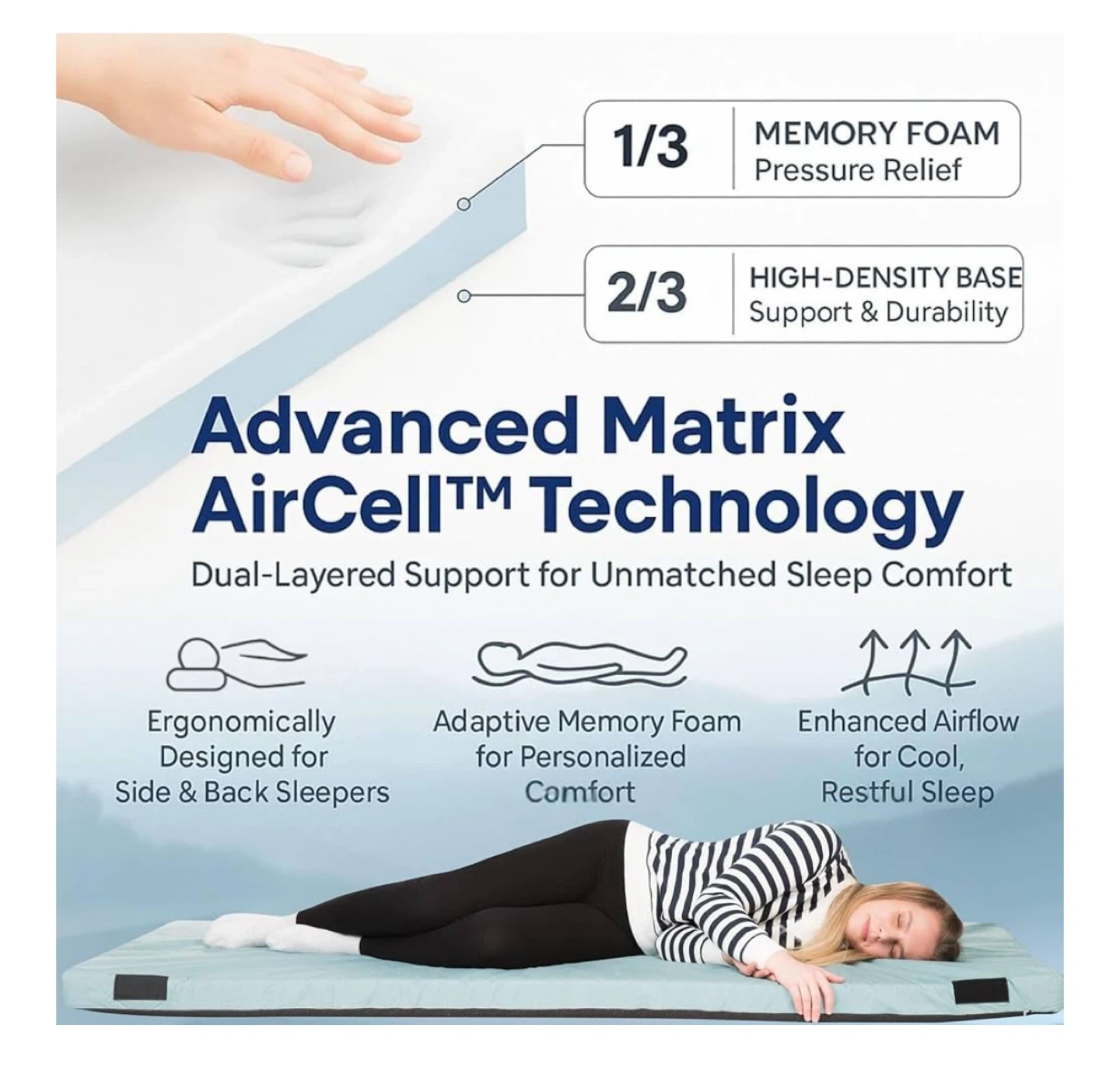 Looking for a comfortable and versatile mattress? This Matrix roll-up memory foam mattress is perfect for guests, camping, or even just for use on hard floors. - Storage bag included - Memory foam for pressure relief - High-density base for support and durability - Advanced Matrix AirCell Technology for dual-layered support and unmatched sleep comfort.