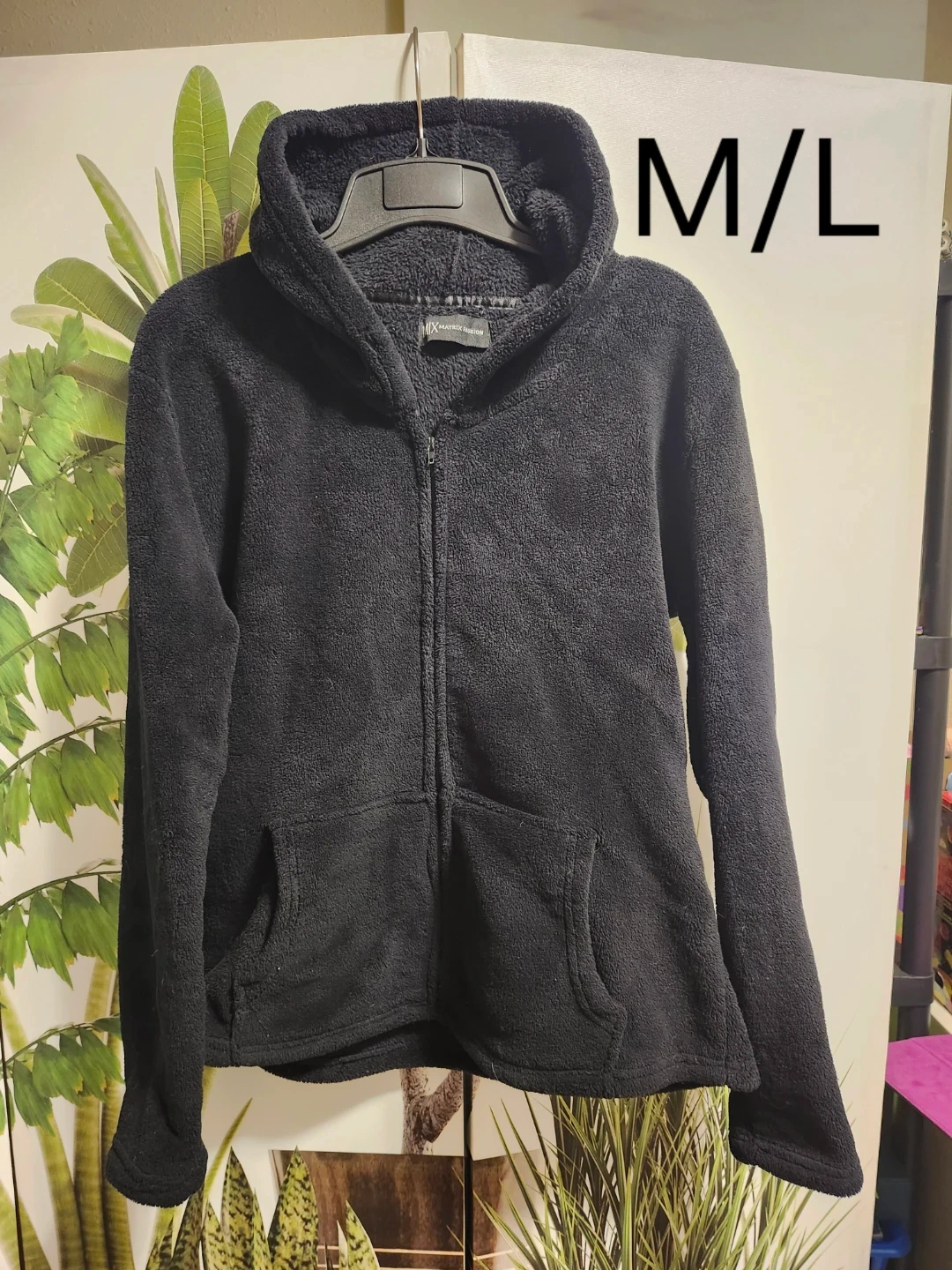 37Cozy black fleece hoodie from Matrix Fashion in size M/L! It's super soft and perfect for layering during those chilly Canadian evenings. Features a full zip and handy pockets!