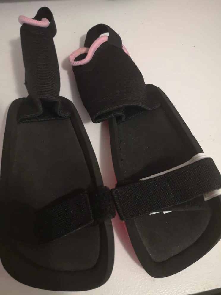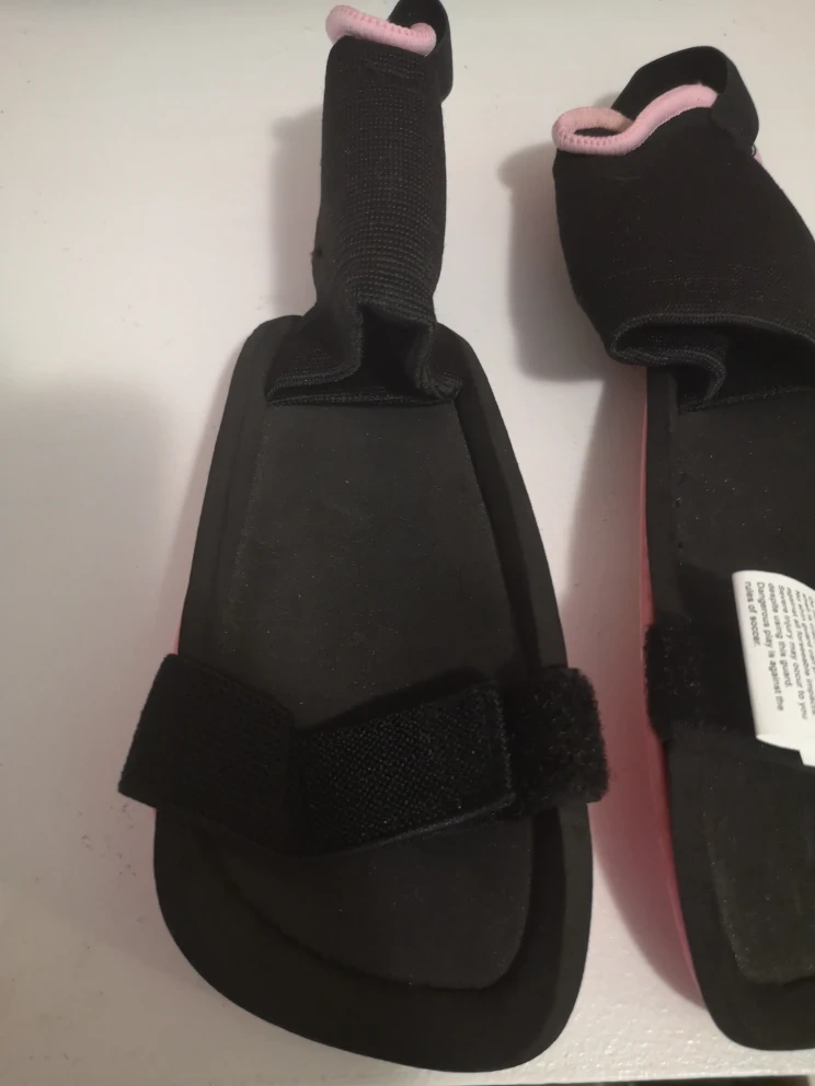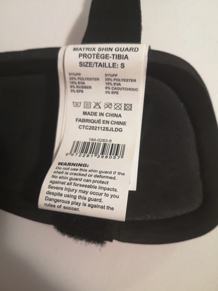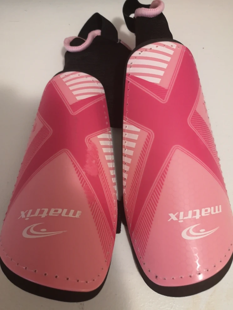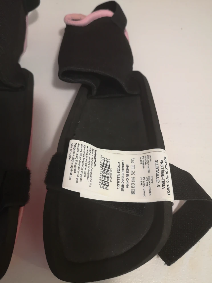 These are Matrix shin guards in size S. They have a pink and white design on the front and are black on the back. The material is made of 51% PP, 25% Polyester, 18% EVA, 6% Rubber, and 3% EPE