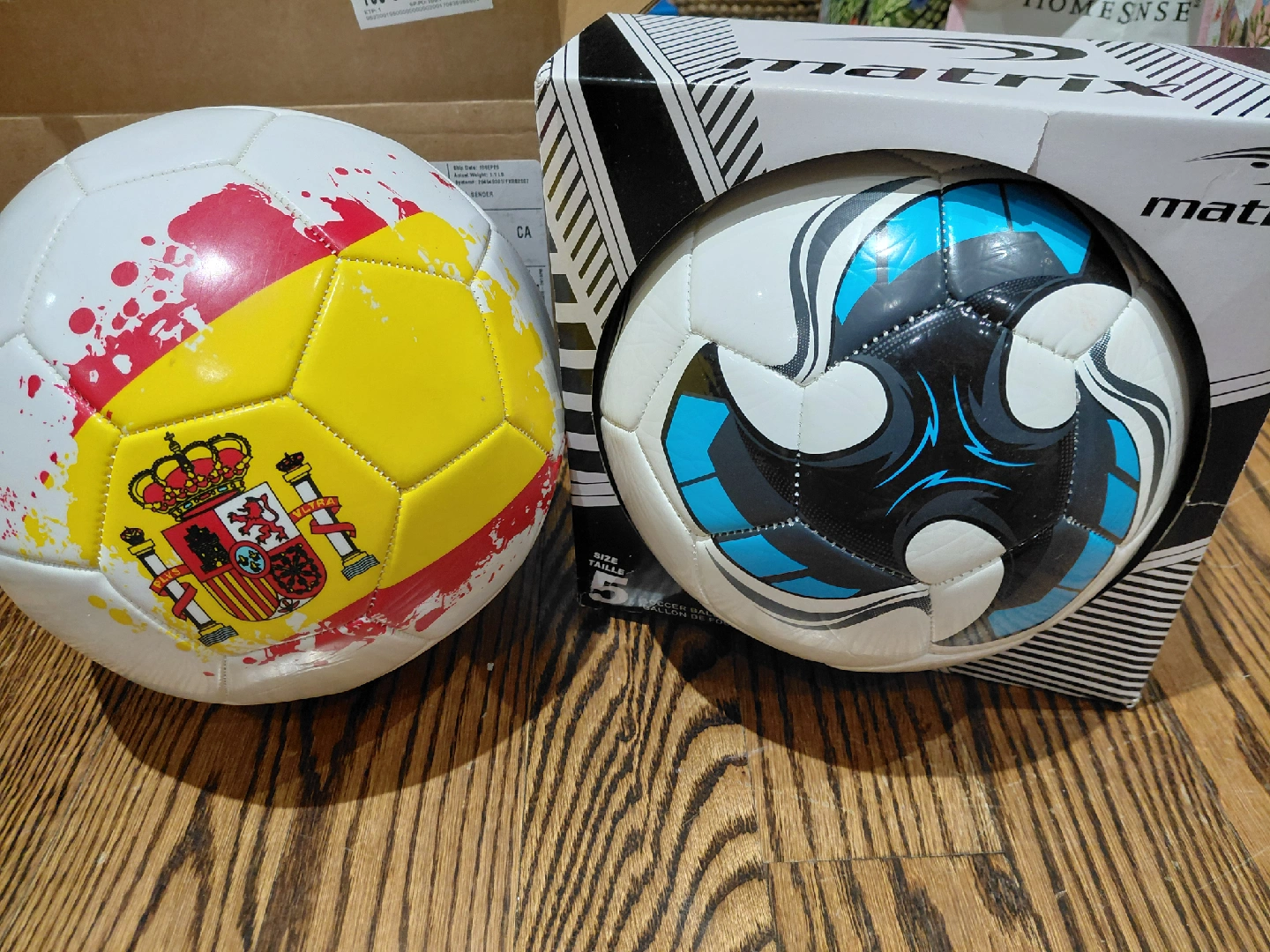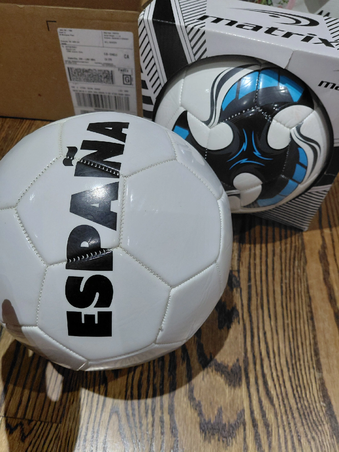 Selling two soccer balls. One is a Matrix brand soccer ball, size 5, still in the box. The other is a white soccer ball with the Spanish flag on it. Matrix ball is in good condition and the Espana ball had a little mark on it and its ready for some fun on the field!
