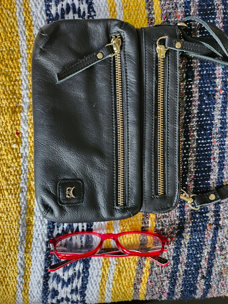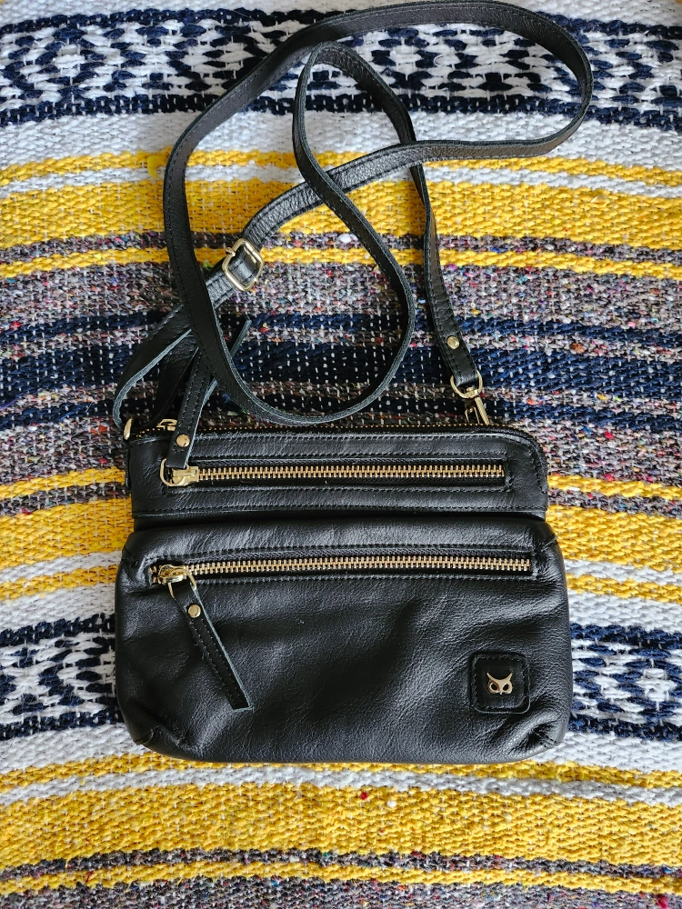 15Selling a Wise Owl crossbody bag in black! It has a few zipper compartments and a long strap for easy carrying. Perfect for everyday use or travel. bag is 6inc × 9inc