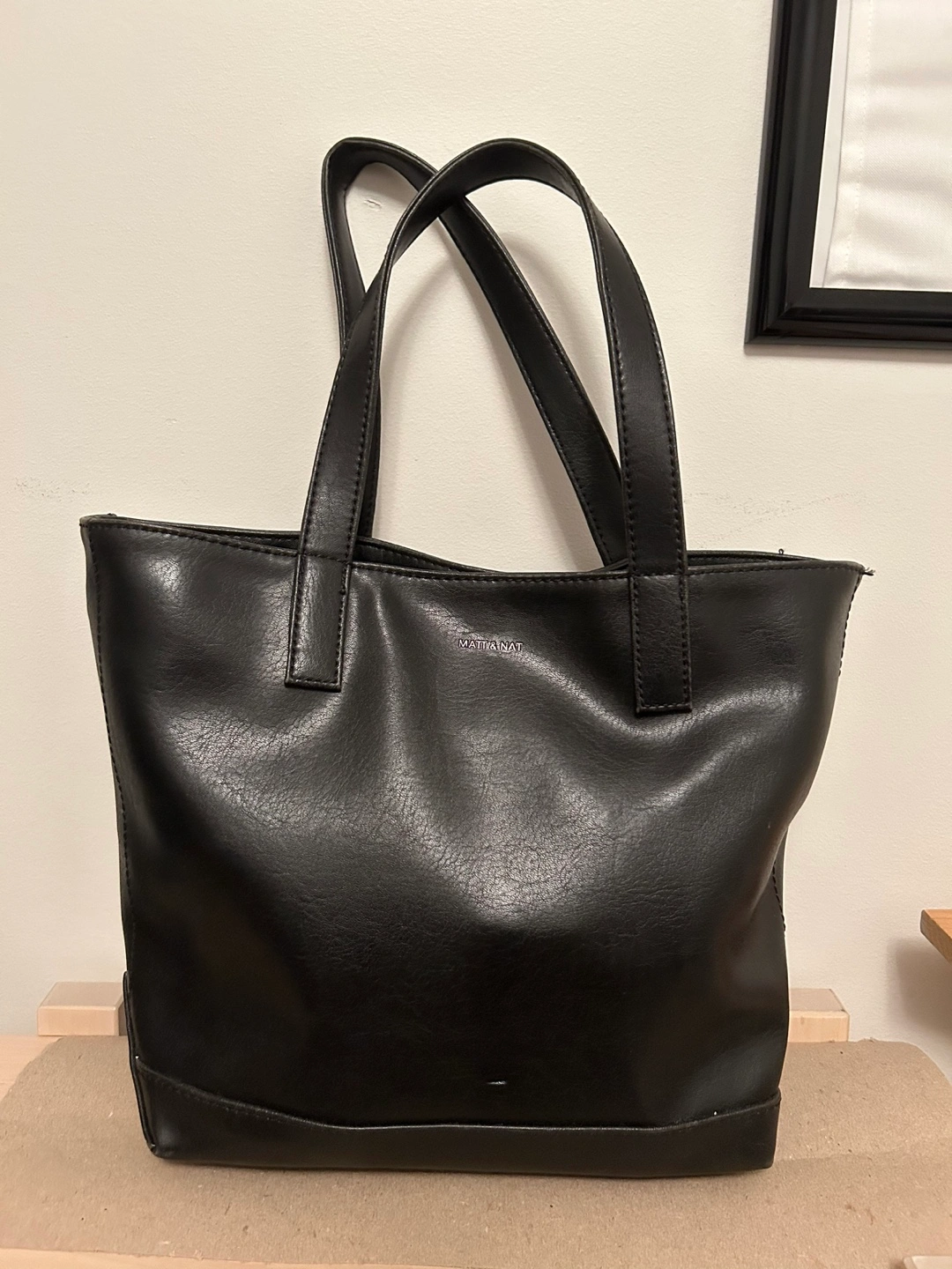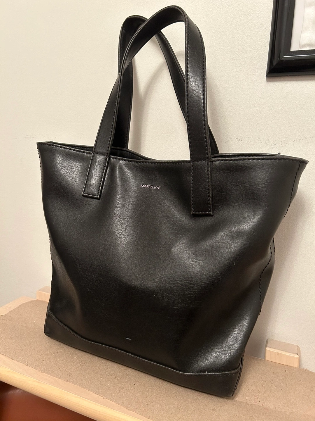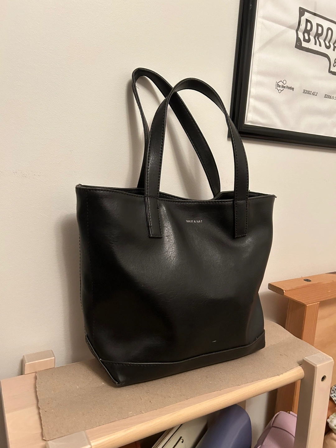 10Black tote bag with two straps. Made of faux leather. White scuff mark on the bottom.