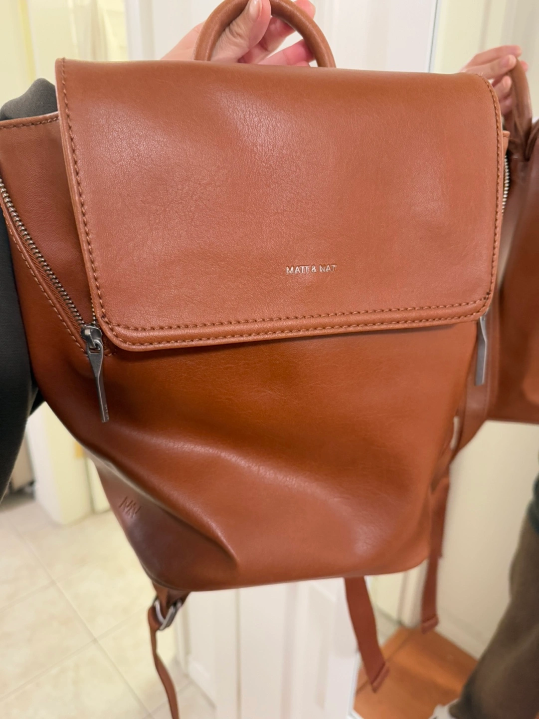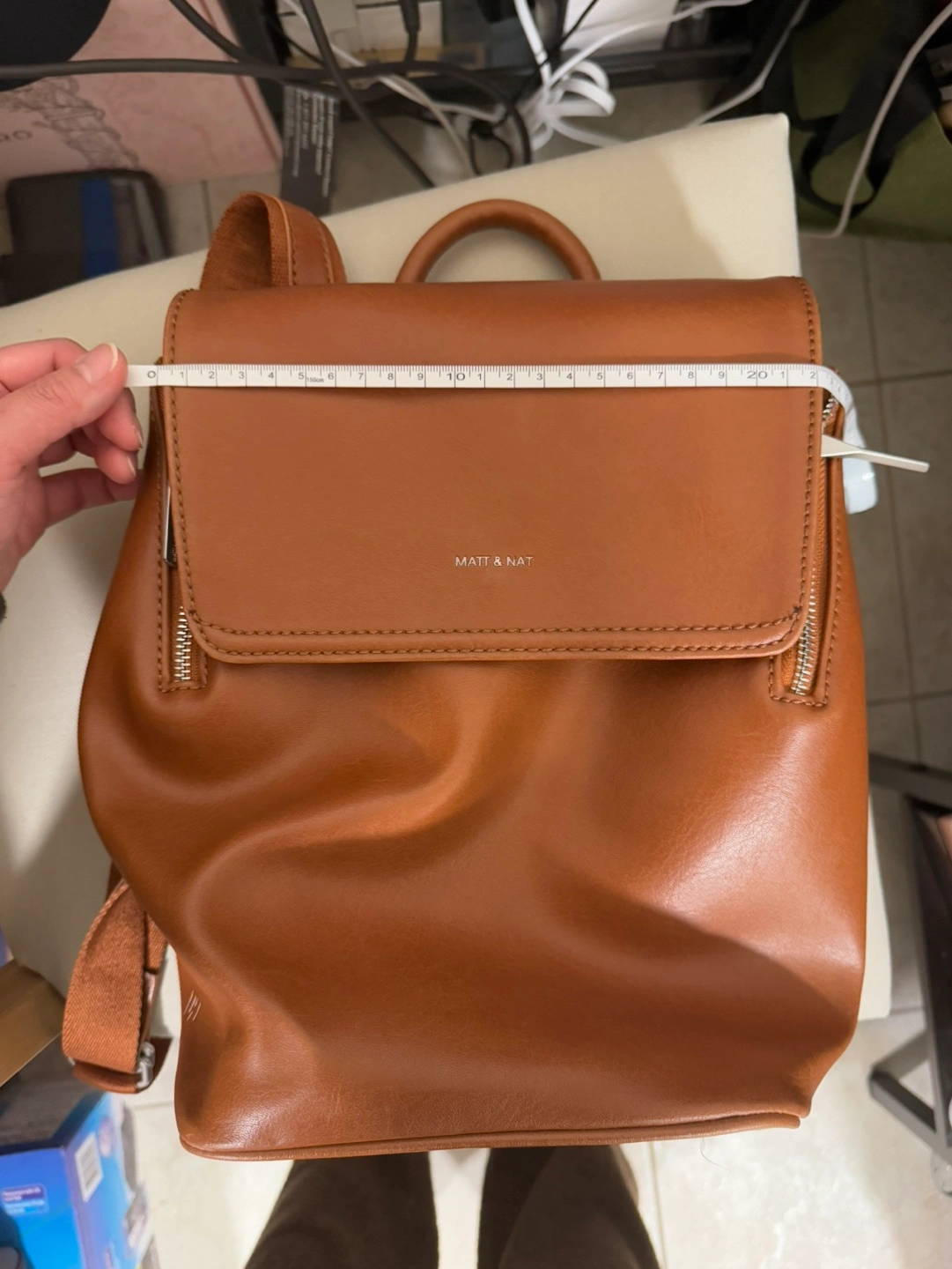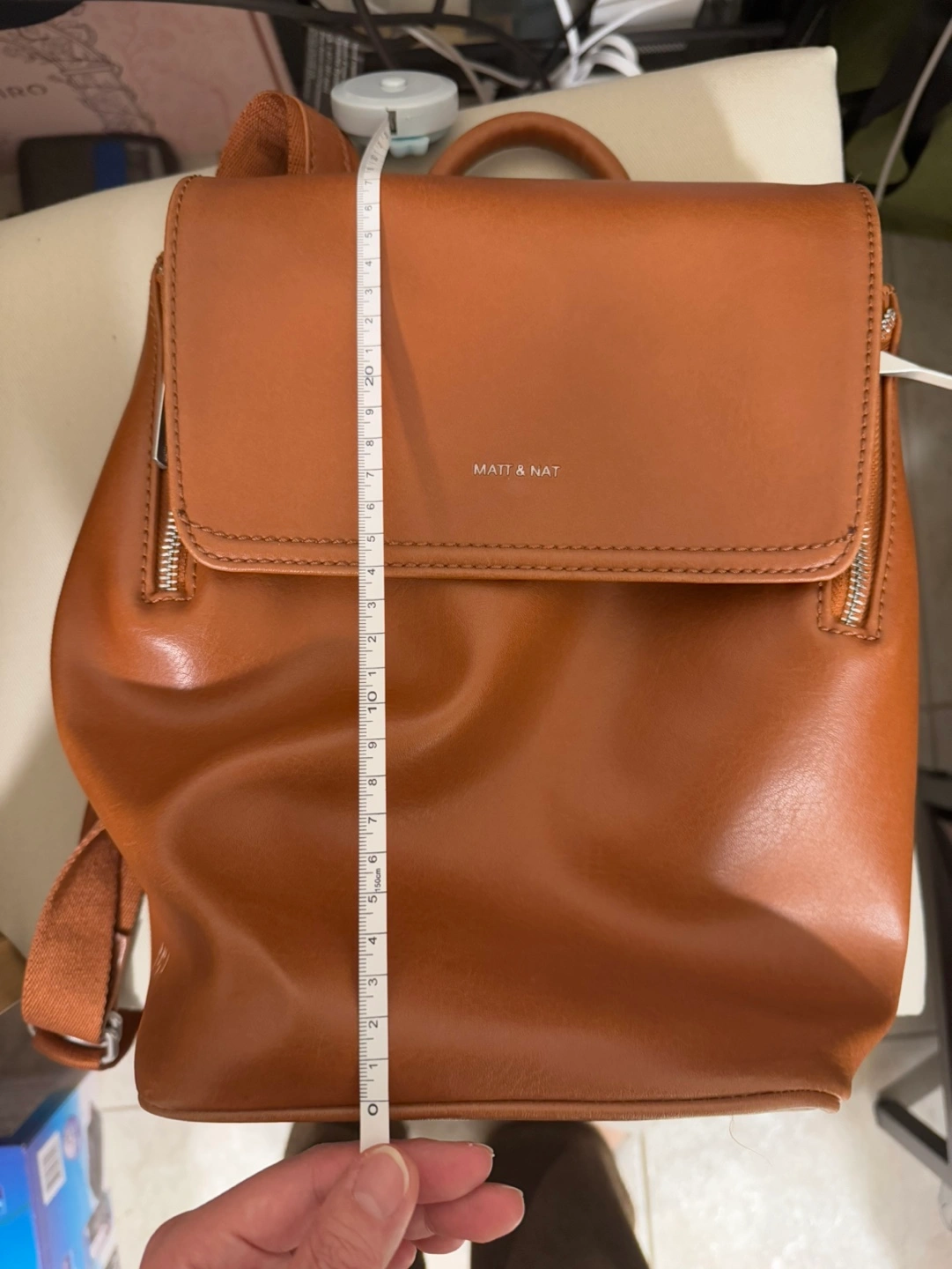 10Brown/caramel vegan leather backpack with silver zippers and hardware. Has a zippered main compartment with a small interior pocket and a top flap closure with a magnetic snap. Two adjustable shoulder straps. Fits most iPads (the one shown in picture is iPad Air 4) Good for school bags