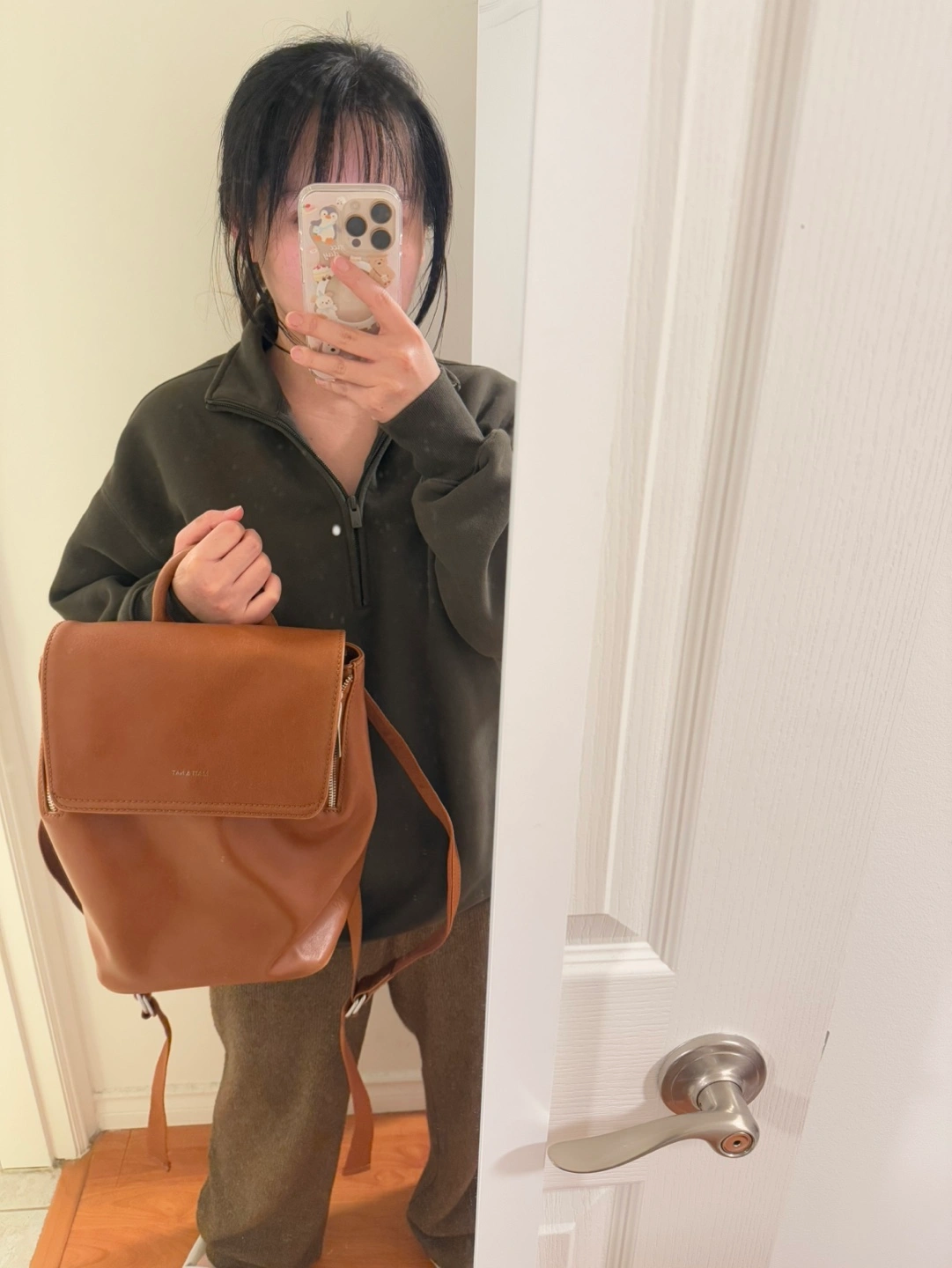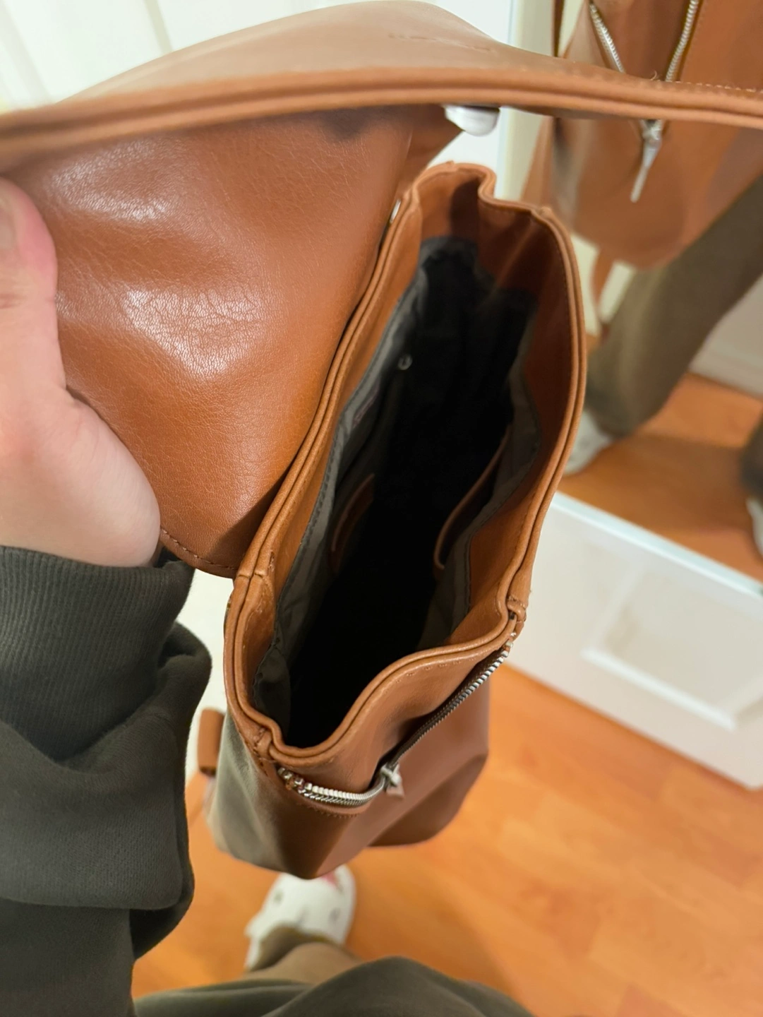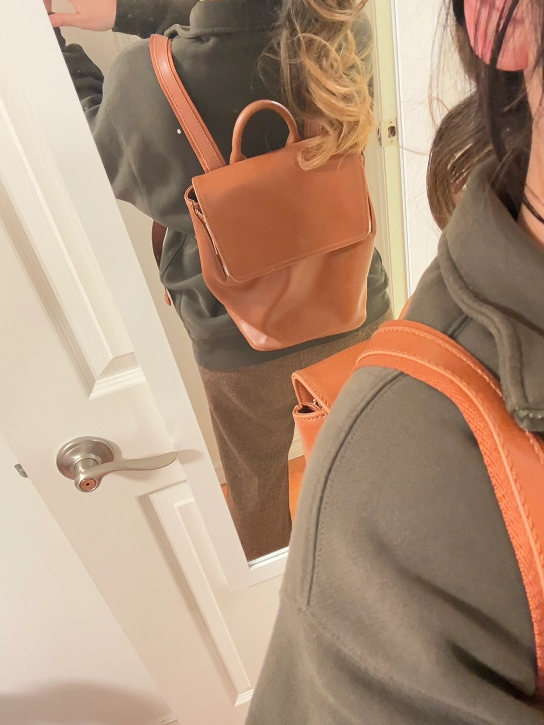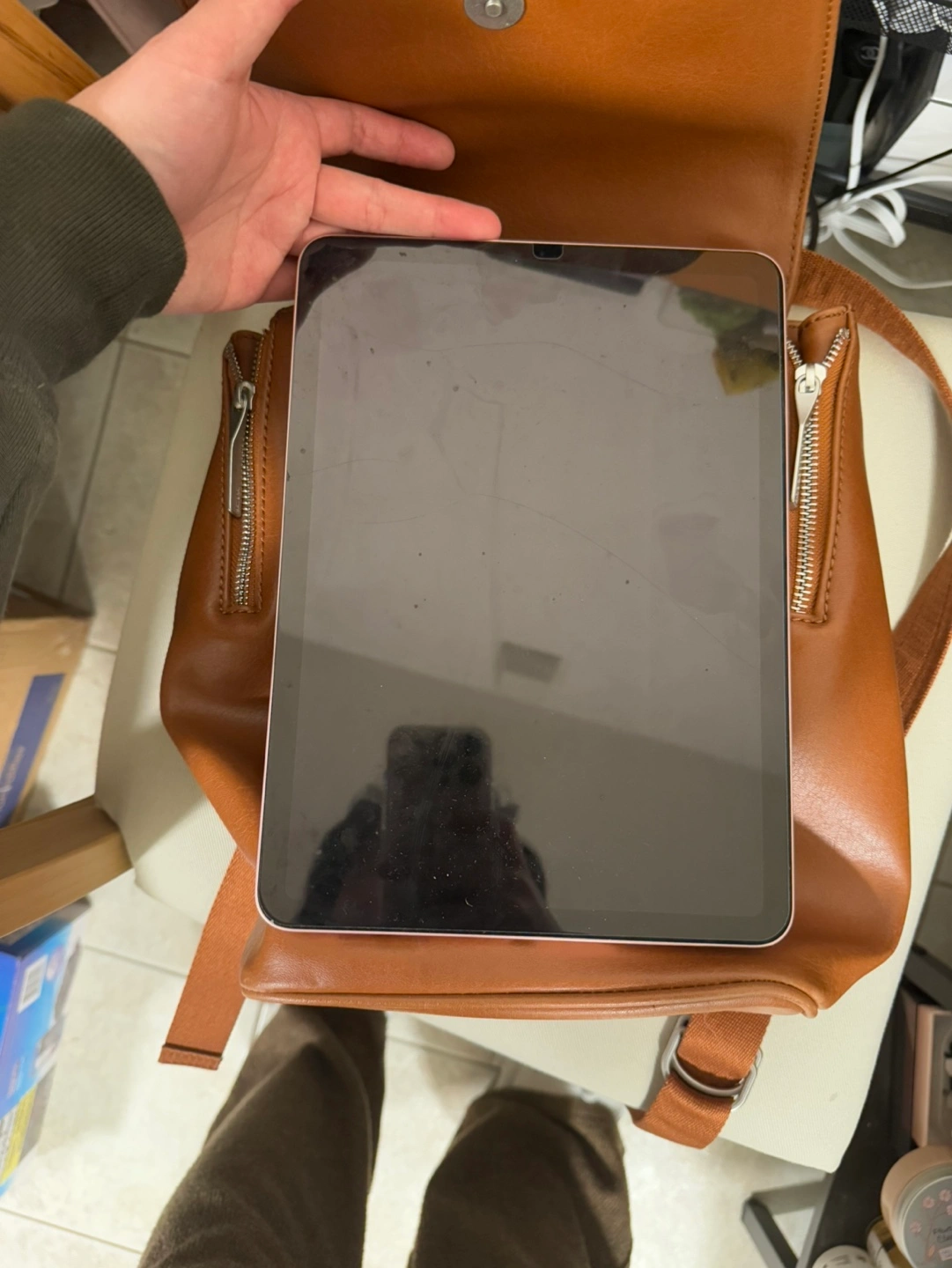 10Brown/caramel vegan leather backpack with silver zippers and hardware. Has a zippered main compartment with a small interior pocket and a top flap closure with a magnetic snap. Two adjustable shoulder straps. Fits most iPads (the one shown in picture is iPad Air 4) Good for school bags