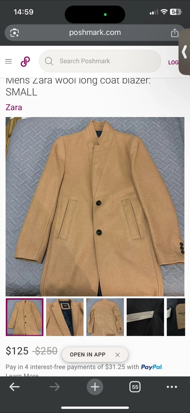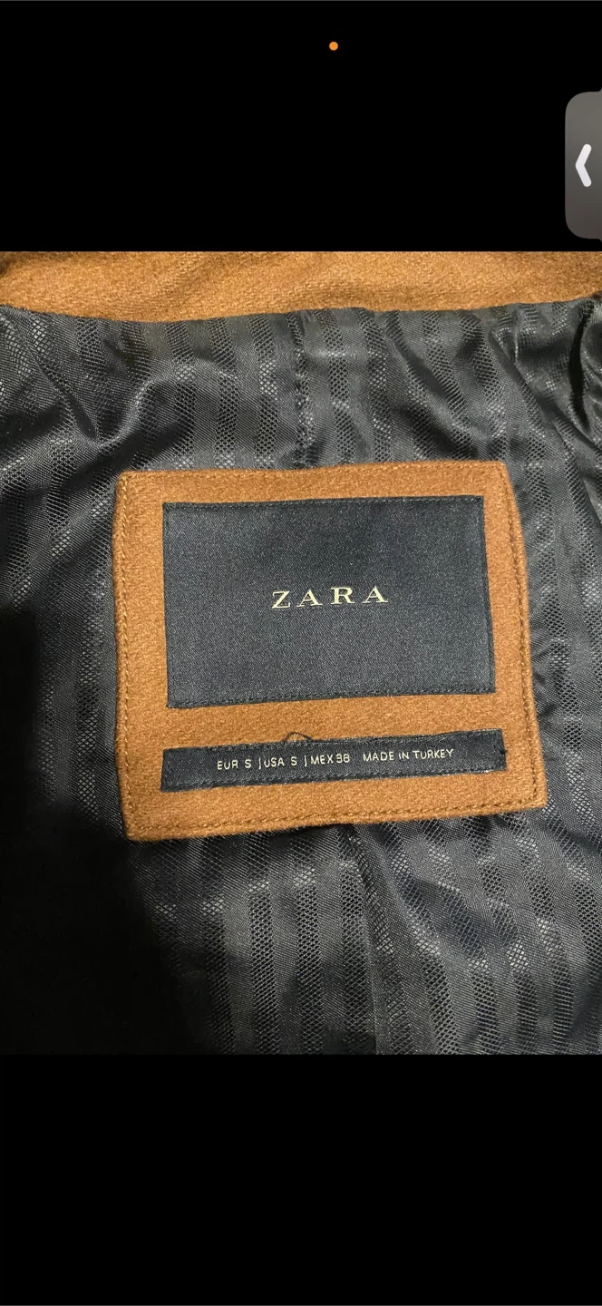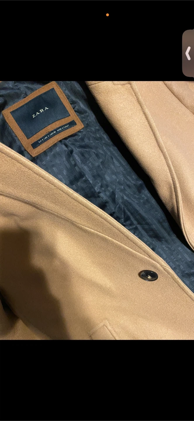 This is a Zara men's camel-coloured wool blend coat. It features a standing collar and a two-button closure. This coat would be a stylish addition to any fall or winter wardrobe.