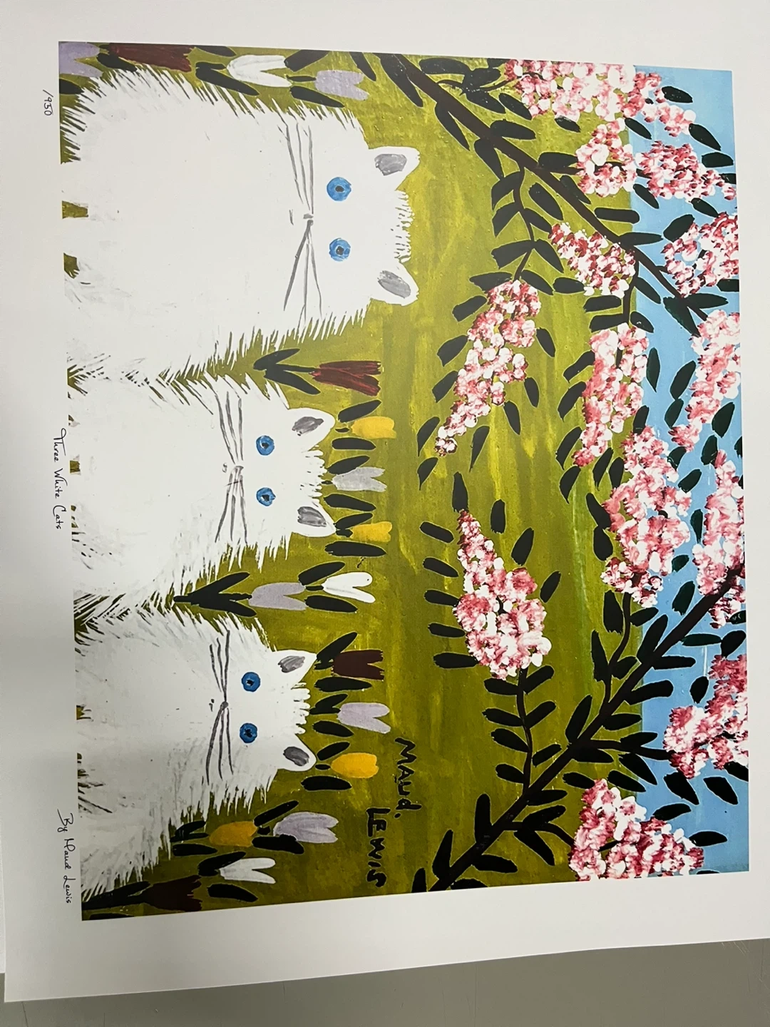 Selling a print of Maud Lewis's Nova Scotia folk artist. "Three White Cats". It's a charming piece of Giclee number limited edition print. Image size 20x24 Out side size 24 x28