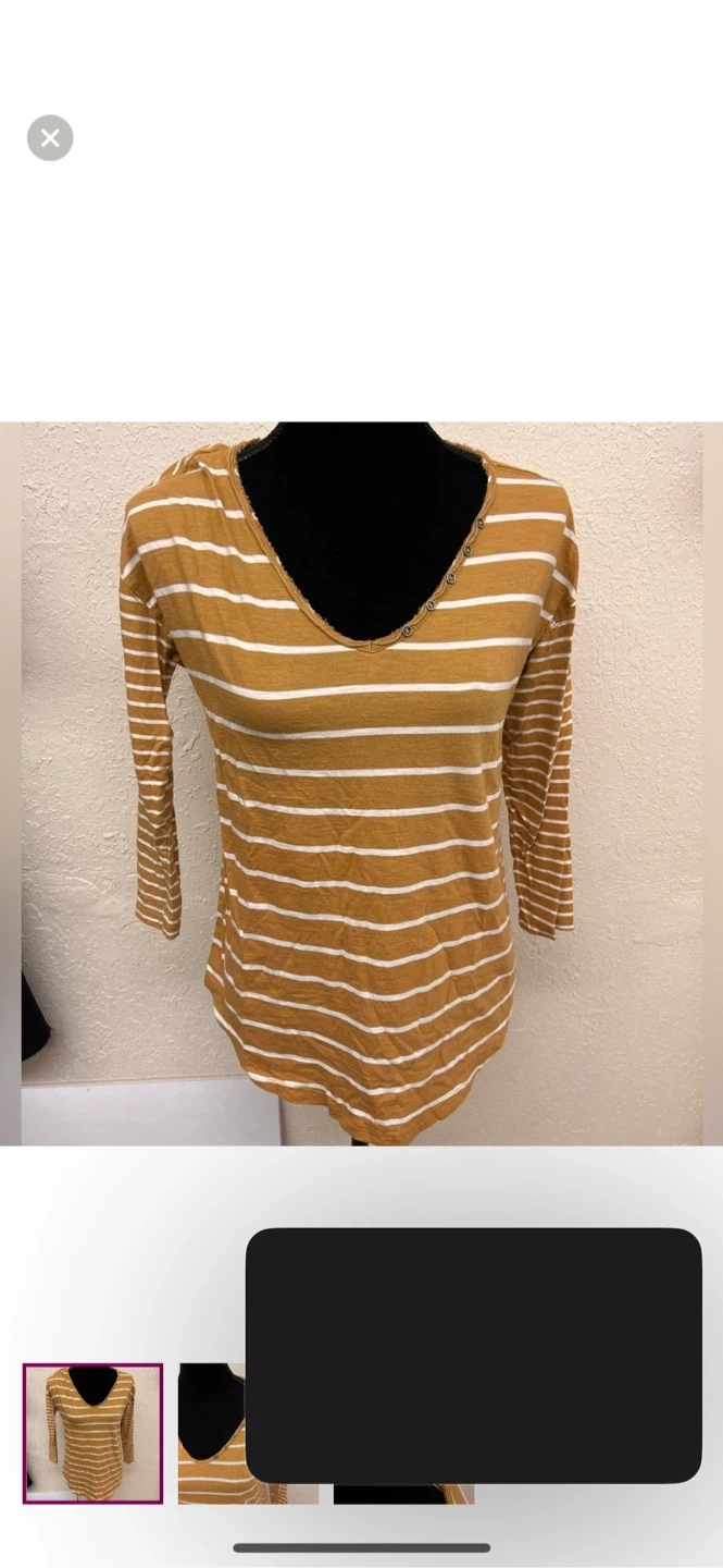 Maurcies brand. Long sleeve vneck shirt. Yellow & white striped. Size small. Brand new condition $5 Pickup between kincardine & ripley or I can arrange delivery in port Elgin-Owen sound, walkerton-Durham, wingham-listowel-kw/cambridge, goderich-bayfield, Woodstock & Arthur-Orangeville-Newmarket-Lindsay-Peterborough AREAS.