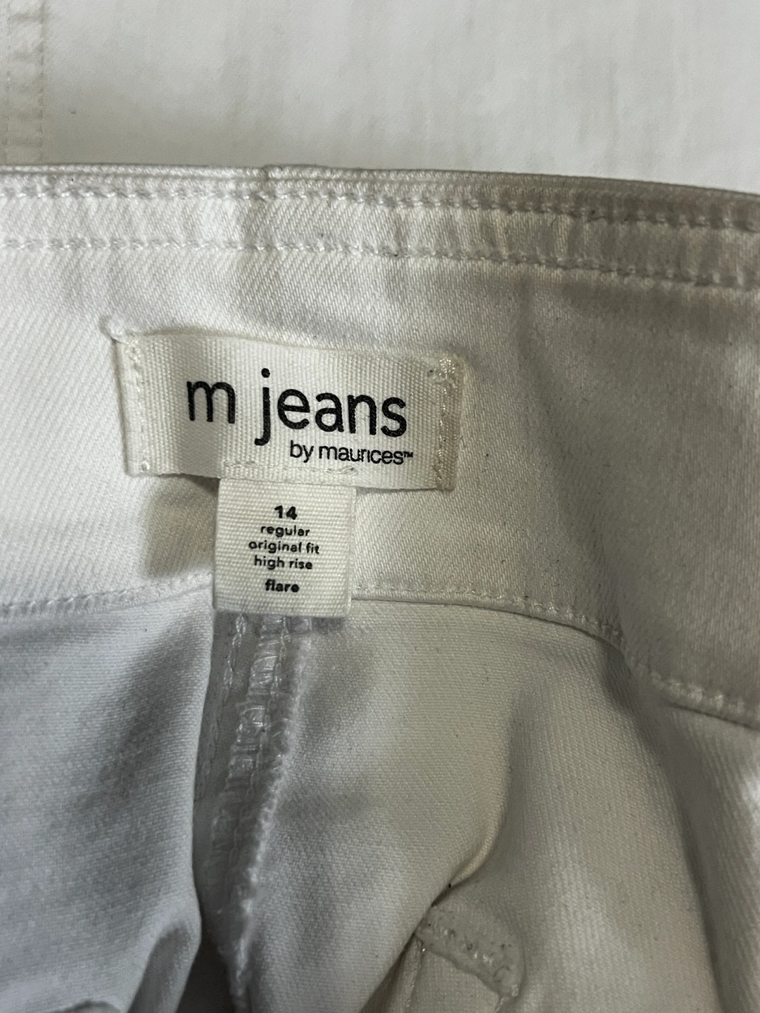 Selling a pair of Maurice's M Jeans in white! These are a size 14, with a regular original fit, high rise, and flare leg. The material is 90% cotton, 8% polyester, and 2% elastane Bought for a specific event and wore them once