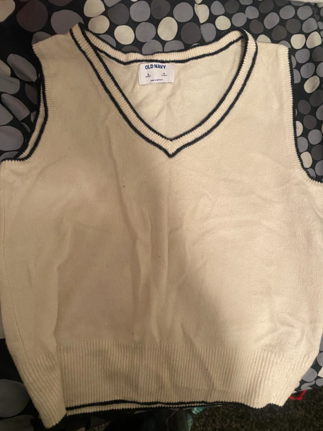 Cream knit sweater vest from Old Navy. It has a v-neckline with navy trim. Size medium. Made of 96% polyester and 4% spandex.