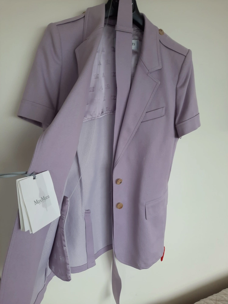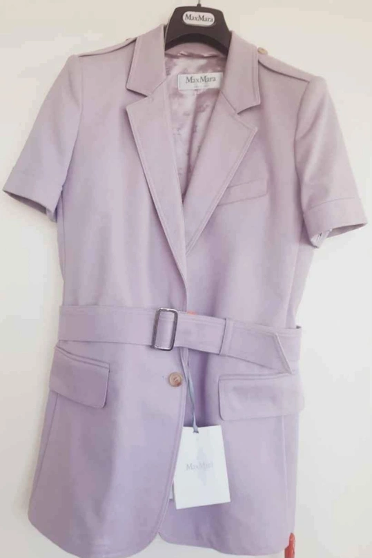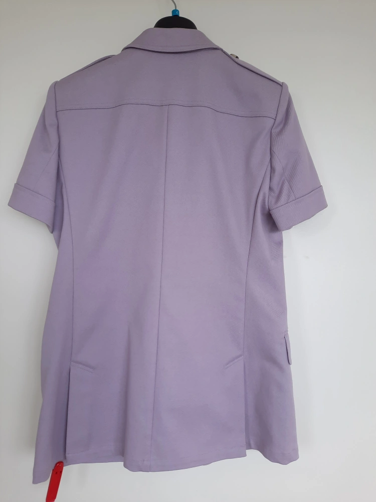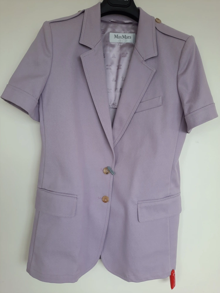 A lovely short sleeve blazer in a light purple colour. It appears to have buttons down the front, and pockets. The sleeves are cuffed, and it has shoulder accents. Pairing this item with some neutral pants will bring a sense of calm to your day.
