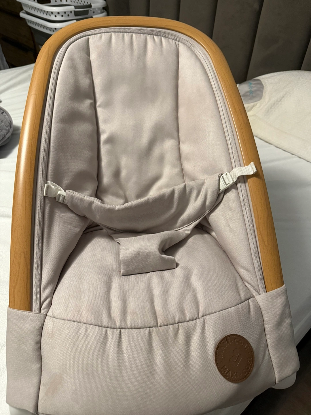 5Grey fabric. Wooden frame. Infant rocker. Gently used. Excellent condition. Used only 6 months Paid over 200