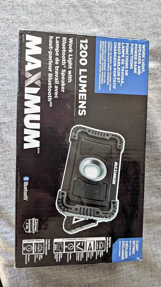 36Brand New never used Maximum 1200 lumen COB work light and Bluetooth speaker. Also doubles as a 8000mah portable battery. Charged and works (see lighting in photo). IPX4 water resistant. Asking $70. Pickup or meet in SW Calgary.