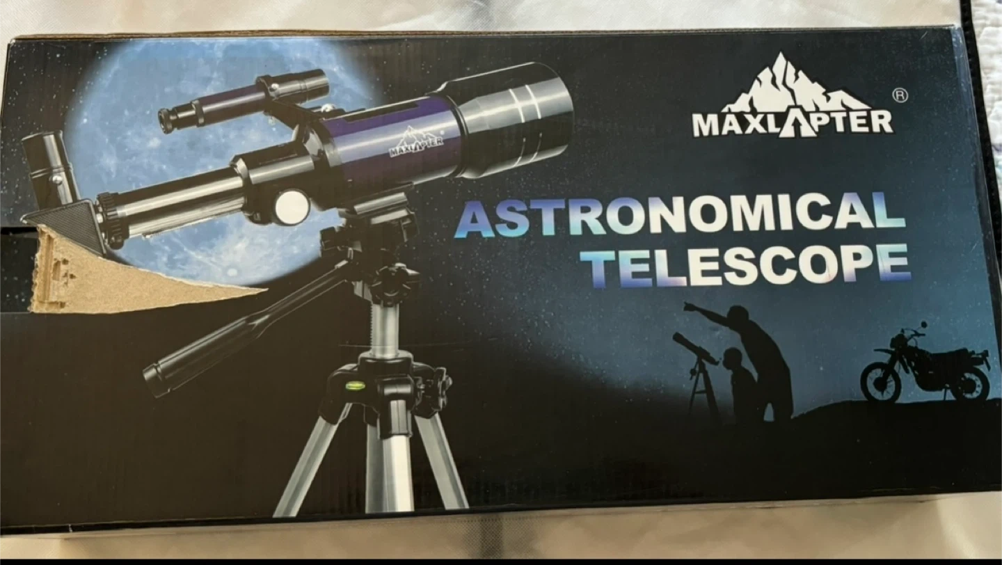 26Maxlapter Astronomical Telescope. New in the box. This refractor telescope is for beginners and children. It typically features a 70mm aperture and a 400mm focal length. It comes with a tripod, eyepieces, and a phone adapter. The optics are described as multi-layer coated for brighter and clearer images.