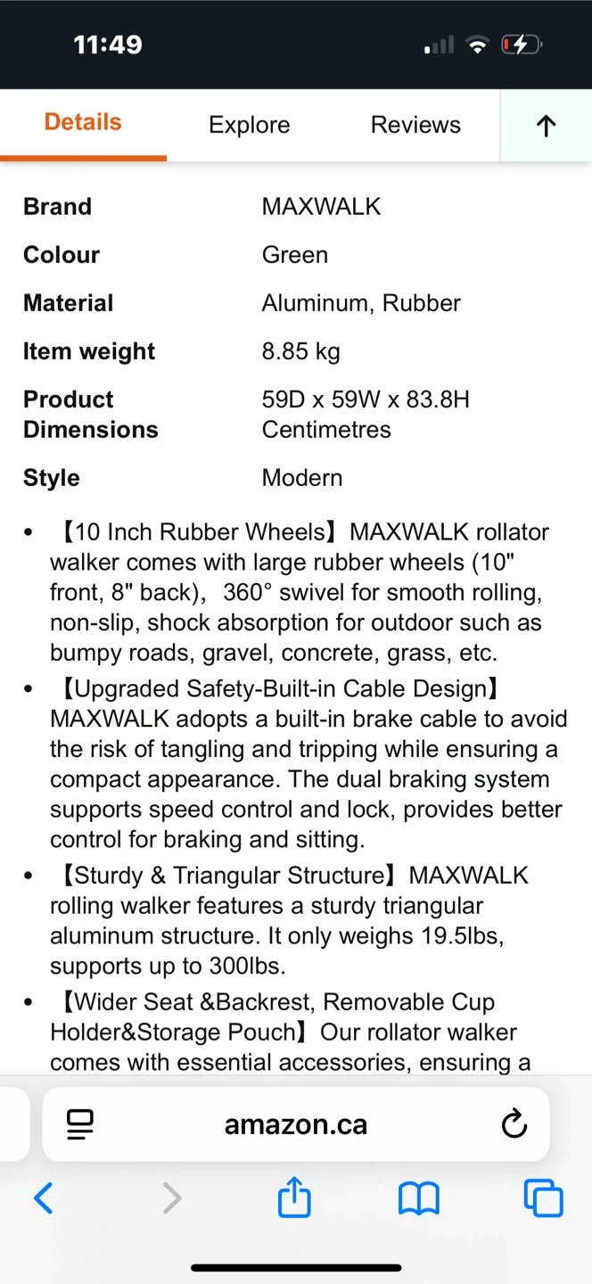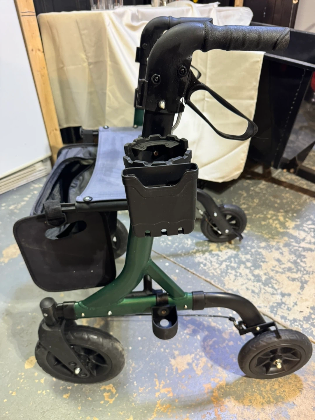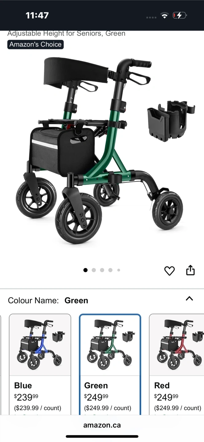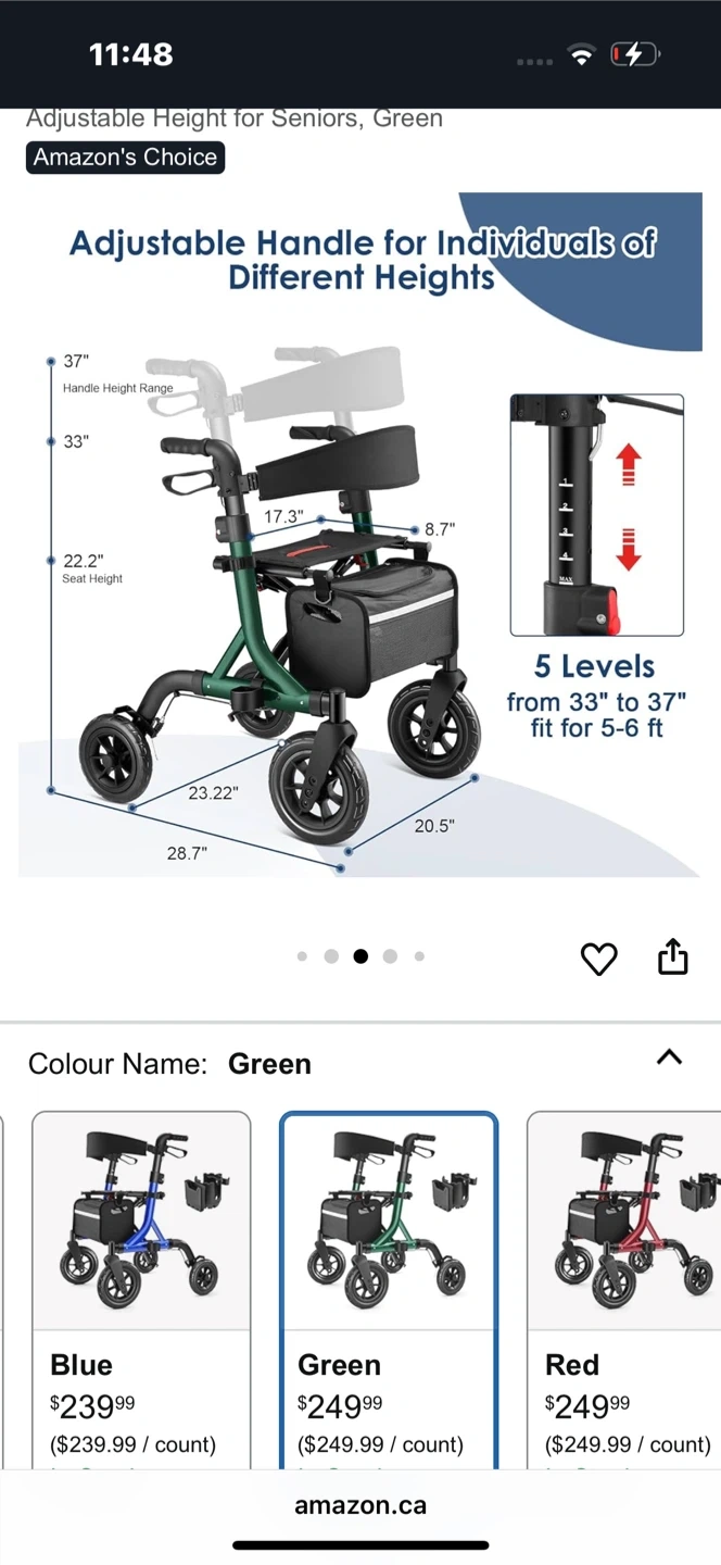 Selling a MAXWALK rollator walker in green. It's designed with adjustable height handles (33"-37") to fit users from 5 to 6.2 ft. Features 10-inch rubber wheels for smooth rolling and a sturdy triangular structure supporting up to 300 lbs. Also includes a removable cup holder and storage pouch for added convenience. Pick up in Baxter, new condition