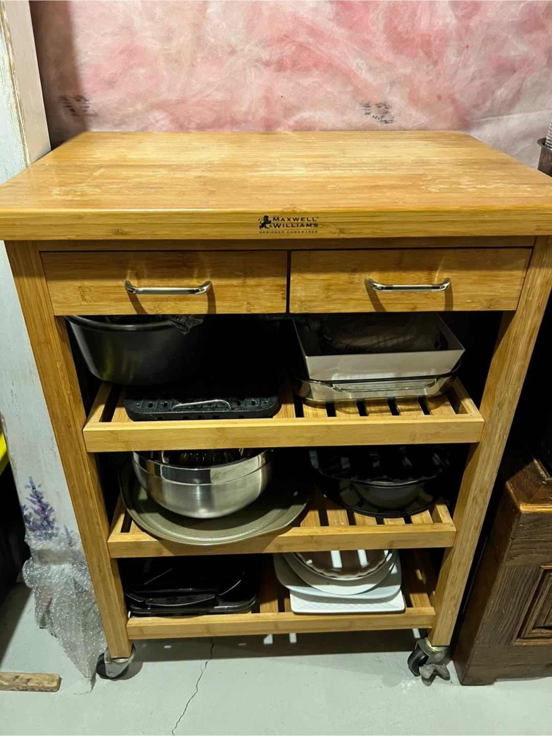 Selling a Maxwell & Williams kitchen cart. It's in great condition and ready to help organize your kitchen or dining area! It has a wooden top with two drawers and shelves for storage