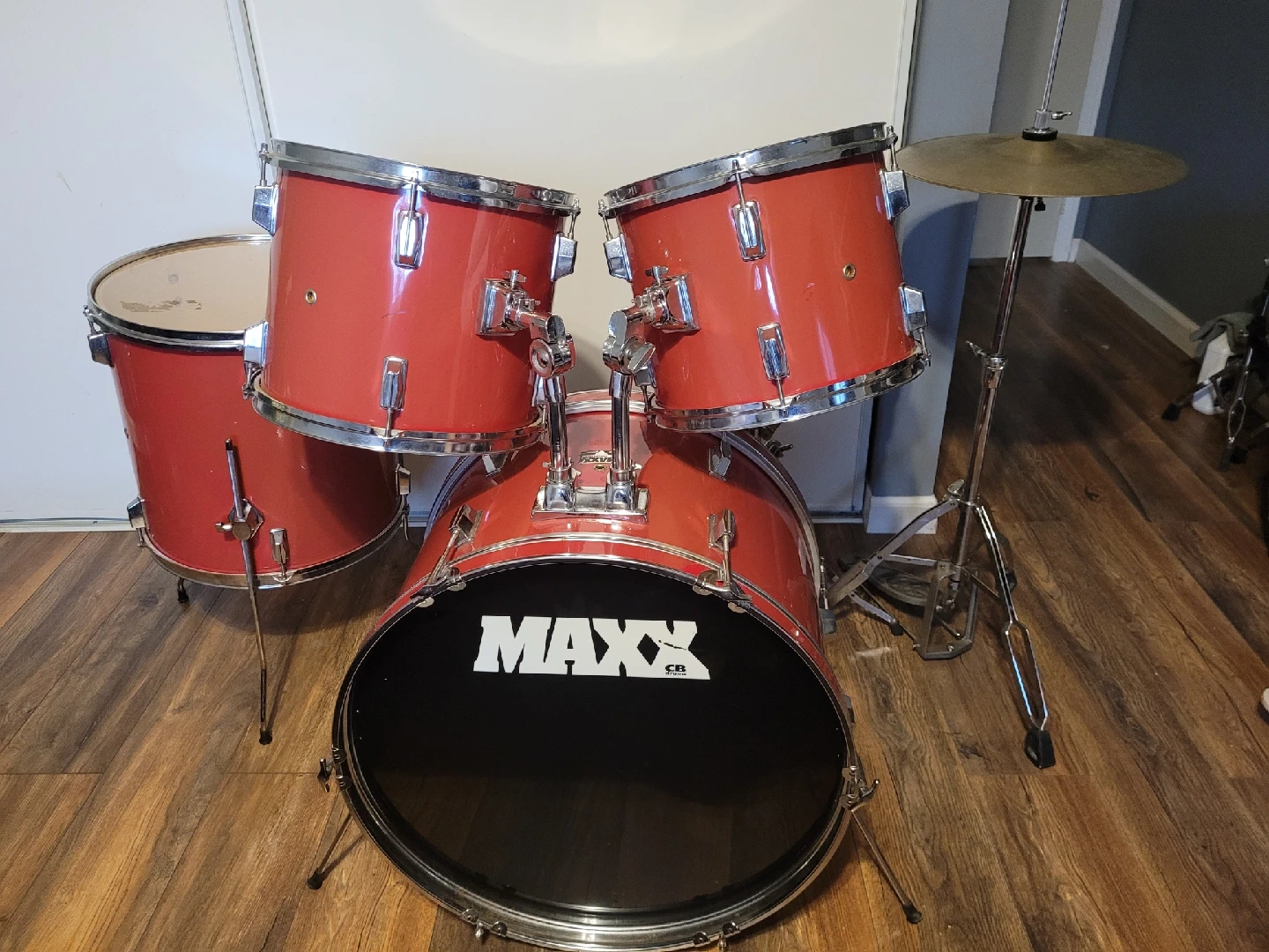 10Selling a Maxx CB 5-piece drum set in red! It's in good condition and ready to be played. Perfect for someone looking to start drumming or upgrade their current set. Includes all the drums and cymbals you see in the pictures.